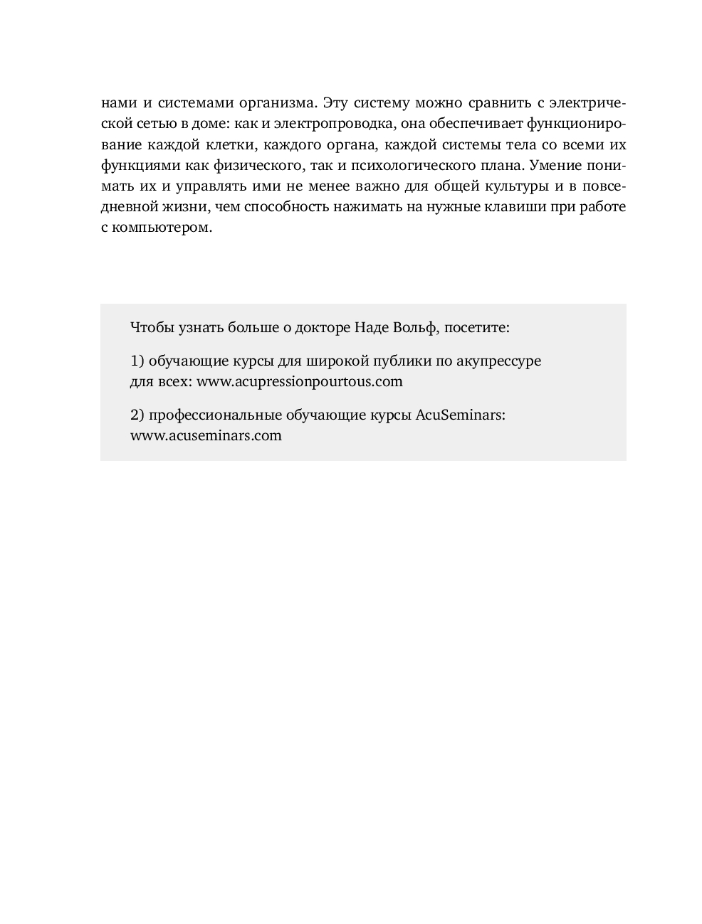 Надя Вольф – доктор медицинских наук, руководитель направления научной акупунктуры в Парижском Университете, член Ассоциации Научной Акупунктуры Франции и Американской Академии Медицинской Акупунктуры, лектор Гарвардской медицинской школы. Уже почти 50 лет она является признанным международным экспертом, обучая своему уникальному подходу.