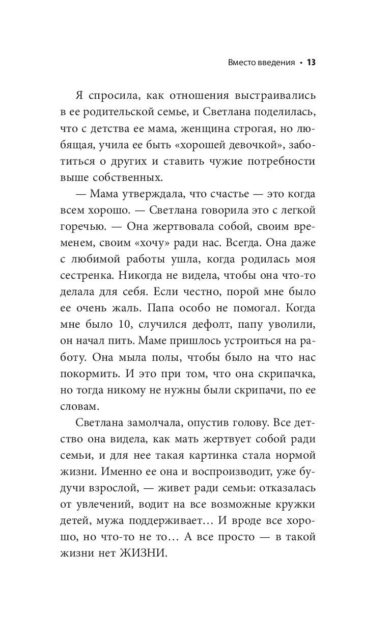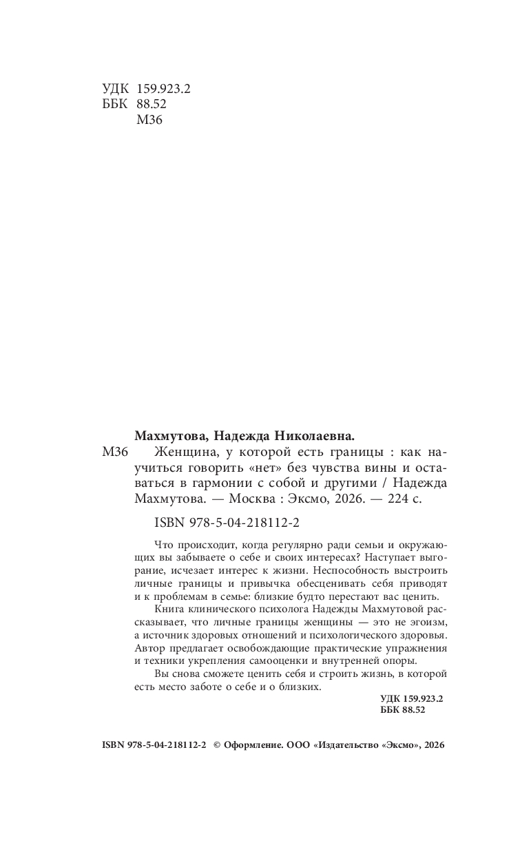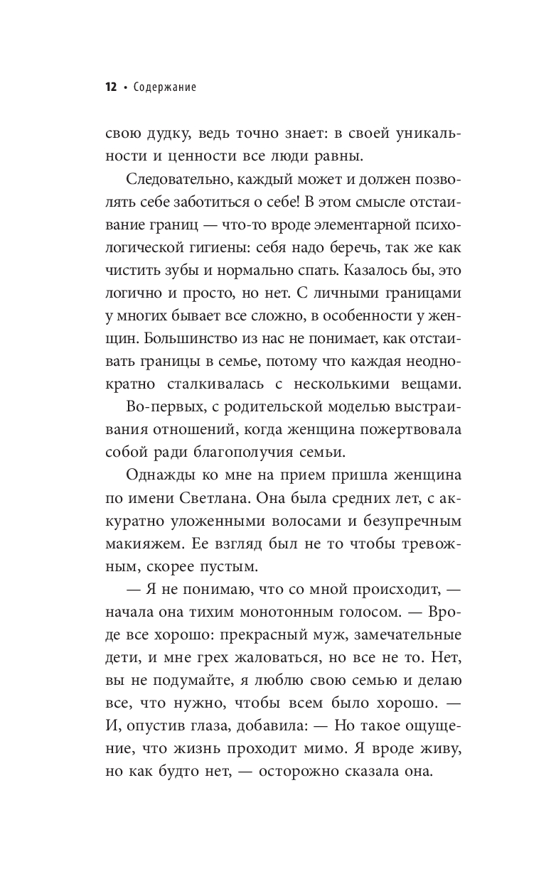 Книга практикующего клинического психолога Надежды Махмутовой помогает женщинам перестать жить чужими ожиданиями и снова услышать собственные желания. Автор мягко и доступно объясняет, почему так легко обесценить себя и как шаг за шагом вернуть внутреннюю опору. Простые упражнения и техники из книги помогут заметить, где ваши границы нарушаются, и научат без чувства вины заботиться о себе, не забывая о близких.