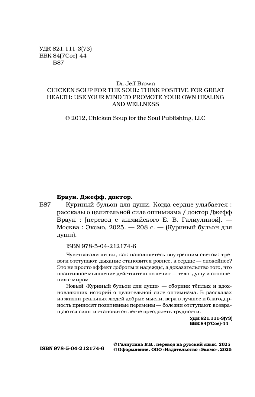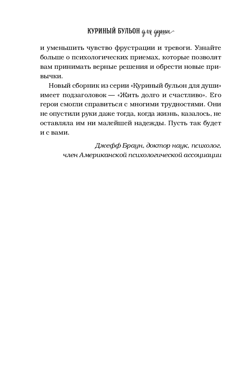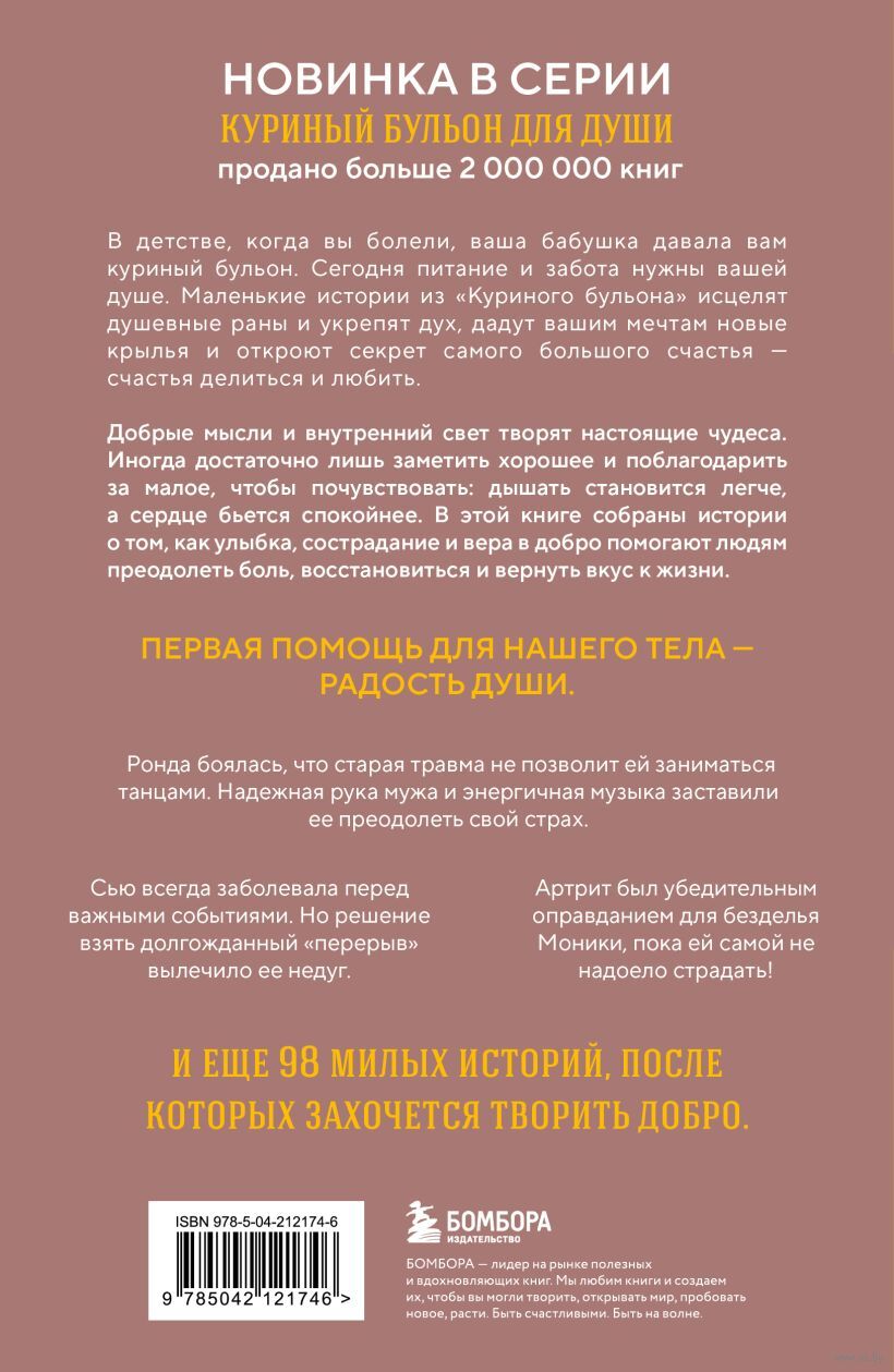 Новый "Куриный бульон для души" – сборник тёплых и вдохновляющих историй о целительной силе оптимизма. В рассказах из жизни реальных людей добрые мысли, вера в лучшее и благодарность приносят позитивные перемены – болезни отступают, возвращаются силы и становится легче преодолеть трудности.