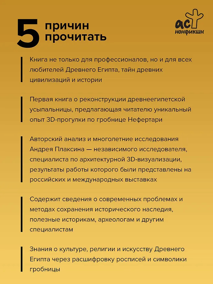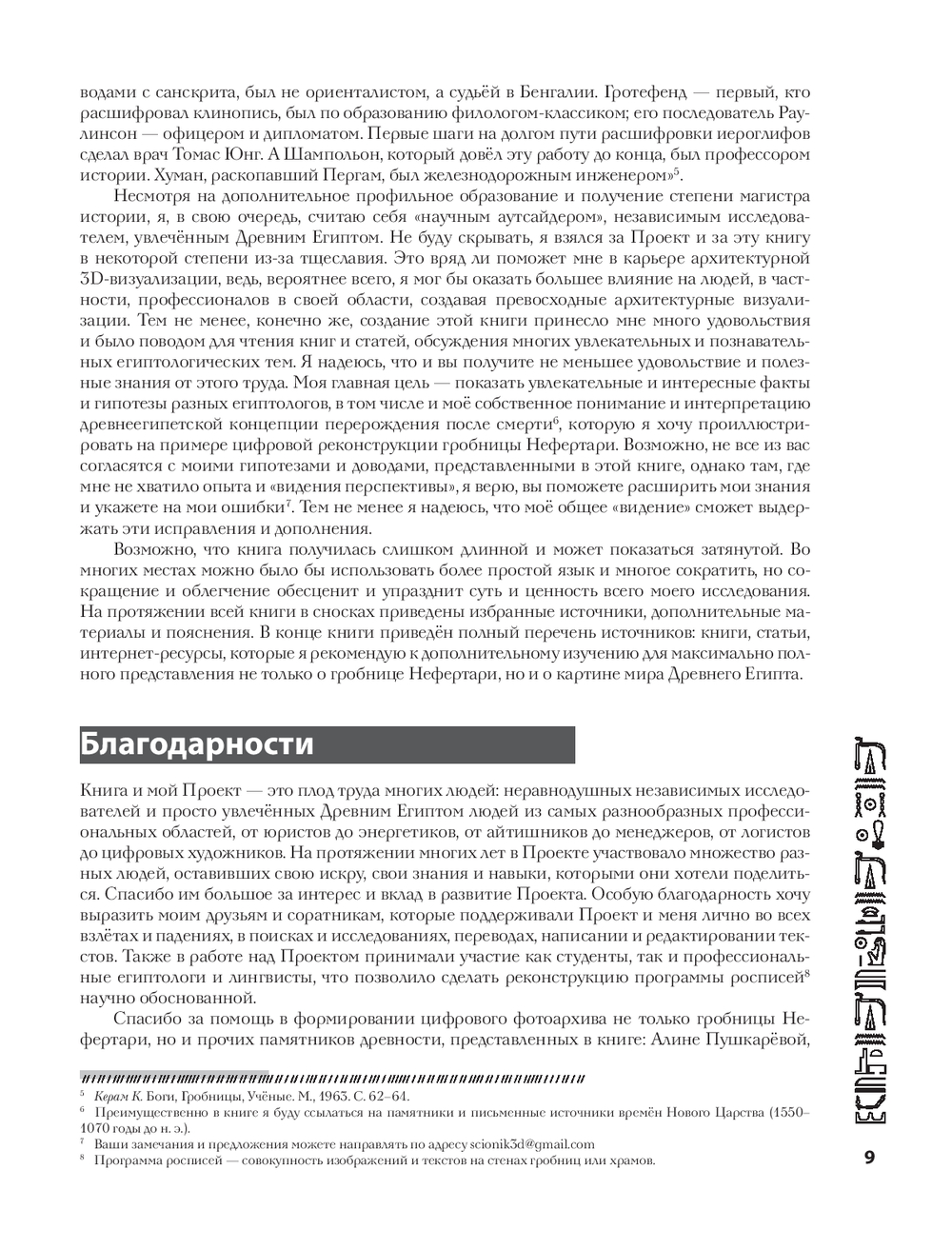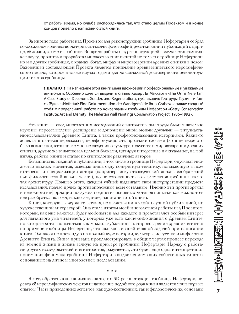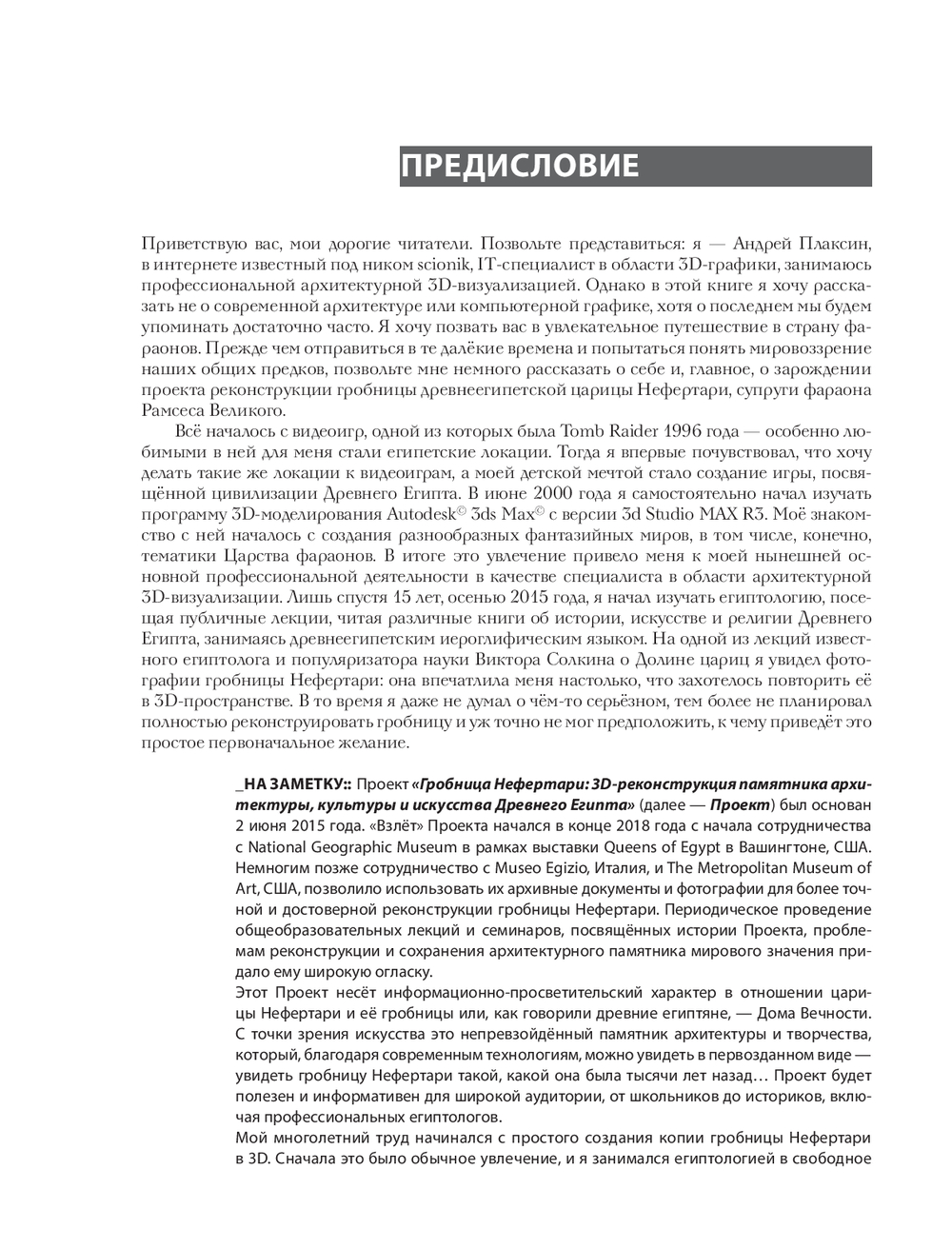 Я впервые увидел фотографии этого архитектурного сооружения на одной из египтологических лекций. Гробница древнеегипетской царицы Нефертари заворожила меня. Мне отчаянно хотелось не представить, а увидеть, какой она была, прибегнув к 3D-технологиям. Чем дольше я погружался в 3D-моделирование, тем больше стремился понять мировоззрение древних египтян, изучить их язык, историю, искусство, постичь смысл восстанавливаемых изображений и надписей. Результат моих многолетних исследований усыпальницы Нефертари – книга, которую вы держите в своих руках, посвященная царице, обретшей покой в своем "доме вечности". На страницах этой книги вы познакомитесь не только с историей и культурой Древнего Египта, но также узнаете о проблемах и методах консервации царской усыпальницы и сможете прочитать программу росписей гробницы.
