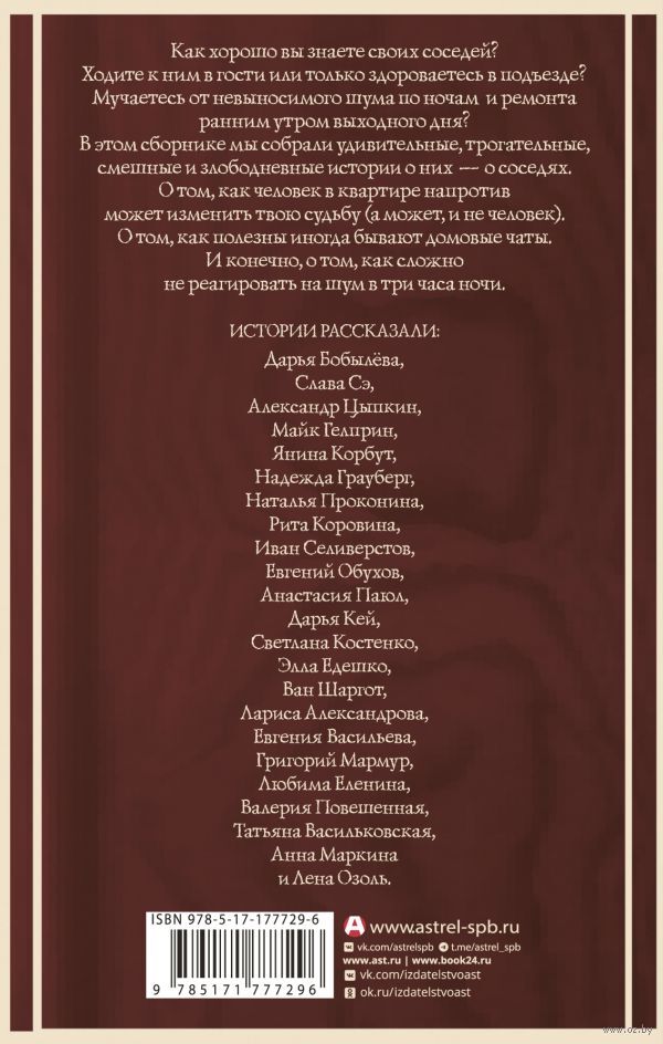 Как хорошо вы знаете своих соседей? Ходите к ним в гости или только здороваетесь в подъезде? Мучаетесь от невыносимого шума по ночам и ремонта ранним утром выходного дня? В этом сборнике мы собрали удивительные, трогательные, смешные и злободневные истории о них – о соседях. О том, как человек в квартире напротив может изменить твою судьбу (а может, и не человек). О том, как полезны иногда бывают домовые чаты. И конечно, о том, как сложно не реагировать на шум в три часа ночи.