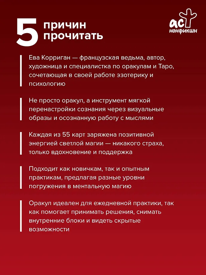 Ева Корриган – французская магическая ведьма, получившая образование в области психологии и окончившая Парижскую школу изящных искусств, автор, художница и специалистка по оракулам и Таро. В своей работе сочетает профессиональные знания с личной чуткость, чтобы помогать другим раскрывать их внутреннюю магию и создавать жизнь, соответствующую истинным желаниям.