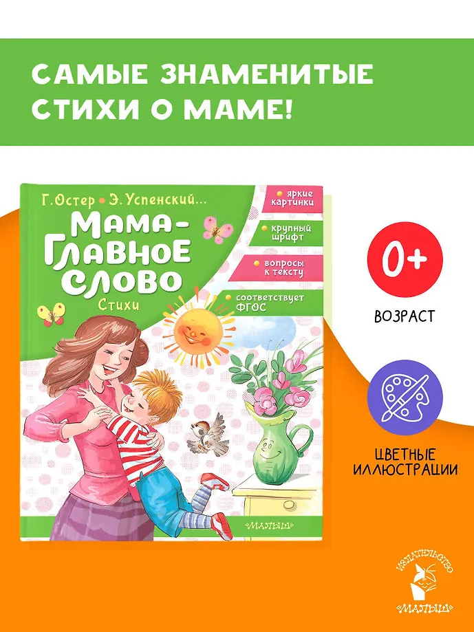 В книгу "Мама – главное слово. Стихи" вошли произведения лучших детских поэтов: А. Барто, В. Берестова, М. Дружининой, Э. Успенского, А. Усачёва и многих других. Каждой маме будет приятно услышать тёплое стихотворение в её честь. В нашей книге непременно найдётся стихотворение, которое ребятам захочется посвятить своей маме и которое с лёгкостью можно выучить наизусть.