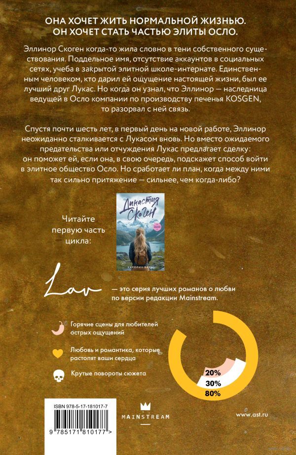 Эллинор Скоген когда-то жила словно в тени собственного существования. Поддельное имя, отсутствие аккаунтов в социальных сетях, учеба в закрытой элитной школе-интернате. Единственным человеком, кто дарил ей ощущение настоящей жизни, был ее лучший друг Лукас. Но когда он узнал, что Эллинор – наследница ведущей в Осло компании по производству печенья KOSGEN, то разорвал с ней связь.