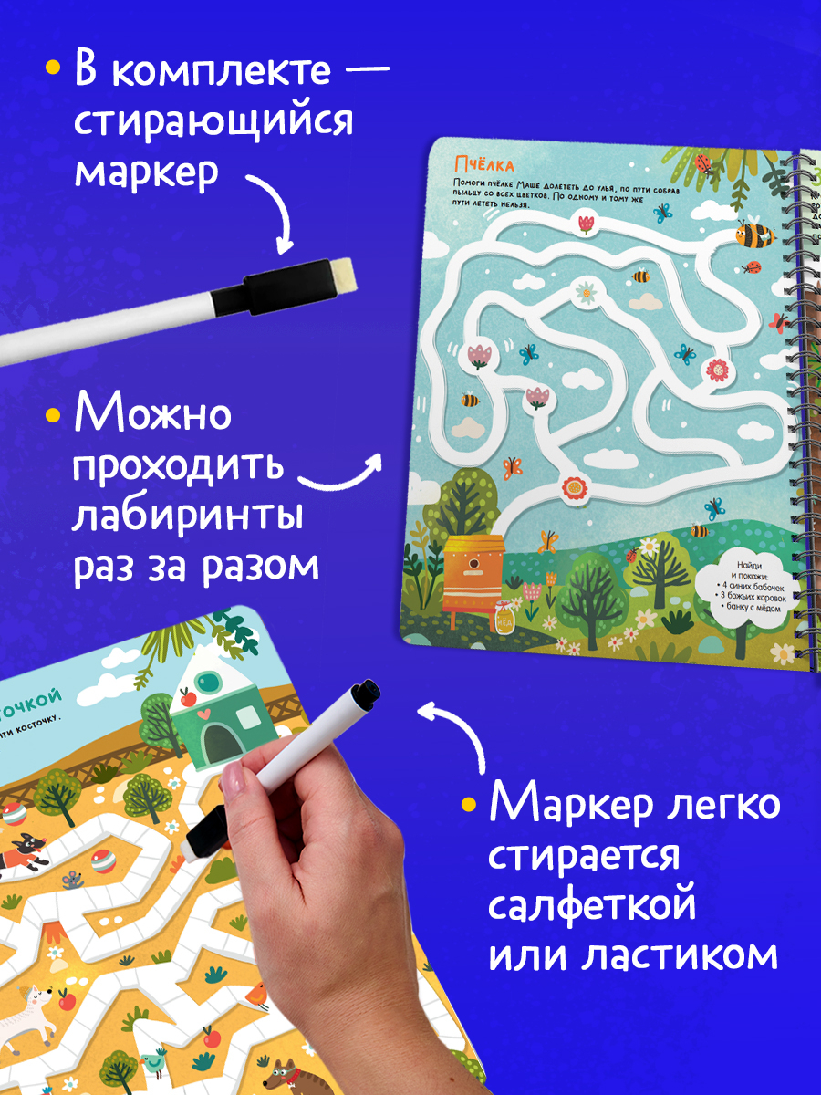 "Лабиринты, ходилки и бродилки" – веселые многоразовые лабиринты, которые помогут ребенку развить мелкую моторику, потренировать логику и внимание, подготовить руку к письму. Рассматривайте красочные детальные иллюстрации, ищите предметы в игре "Найди и покажи" и выполняйте забавные задания!