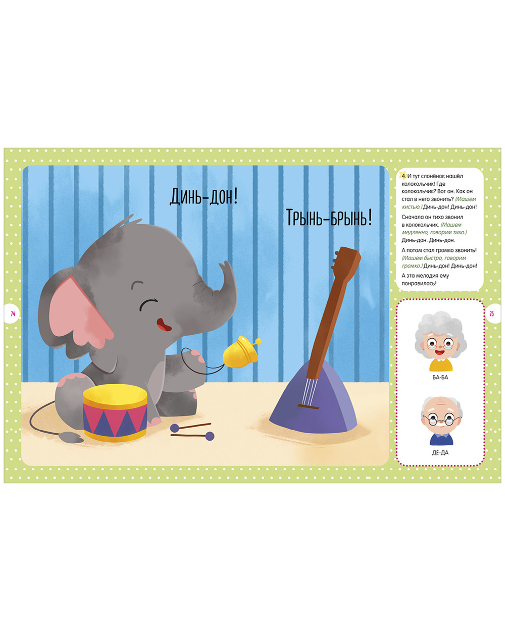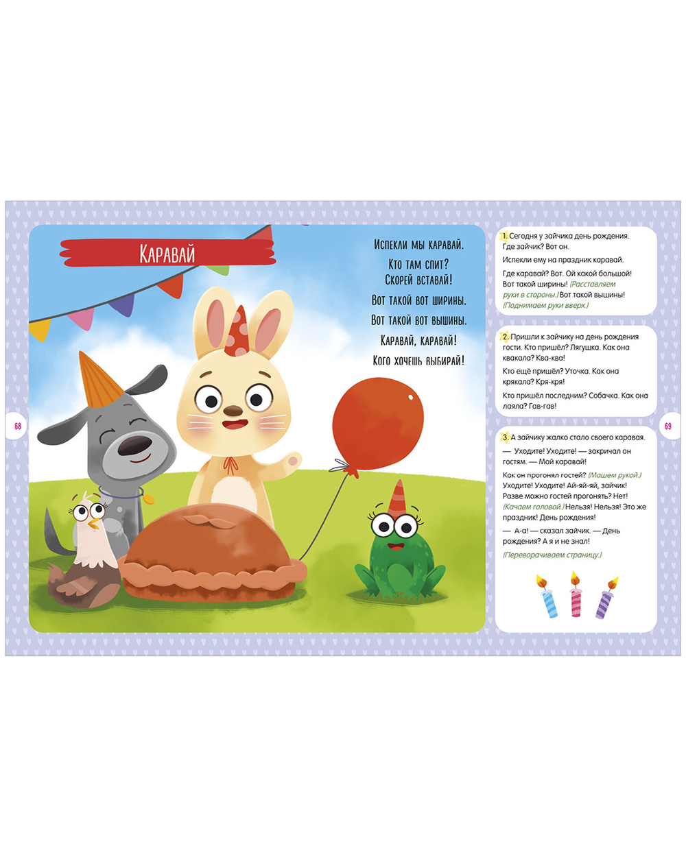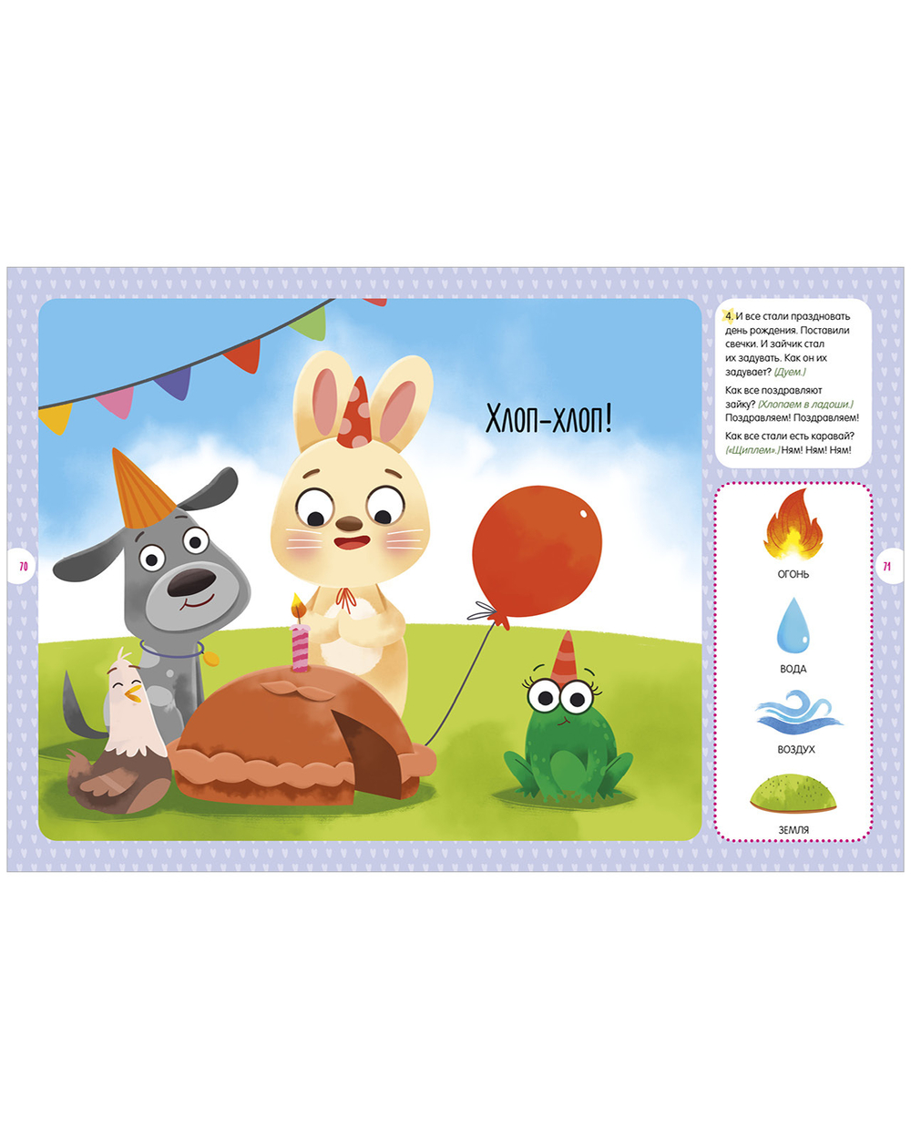 Каждый разворот книги для детей – веселая, яркая история с заданиями на всестороннее развитие ребенка. Он изучит цвета, формы, поиграет в «Найди и покажи», развивая внимание и память, послушает сказки для малышей.