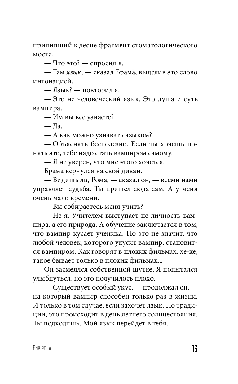 Паровоз мудро устроен, но он этого не сознает, и какая цель была бы устроить паровоз, если бы на нем не было машиниста? Виктор Пелевин, мастер удивительной прозы, приоткрывает нам очередную тайную завесу, обнажает фантастическую и пугающую изнанку мира. Нашего мира, которым правят вампиры. Но не те мифические, что спят днем в красивых гробах и живут в старинных замках, а реальные люди, стоящие во всех эшелонах власти с древнейших времен, когда и власти еще не было никакой.