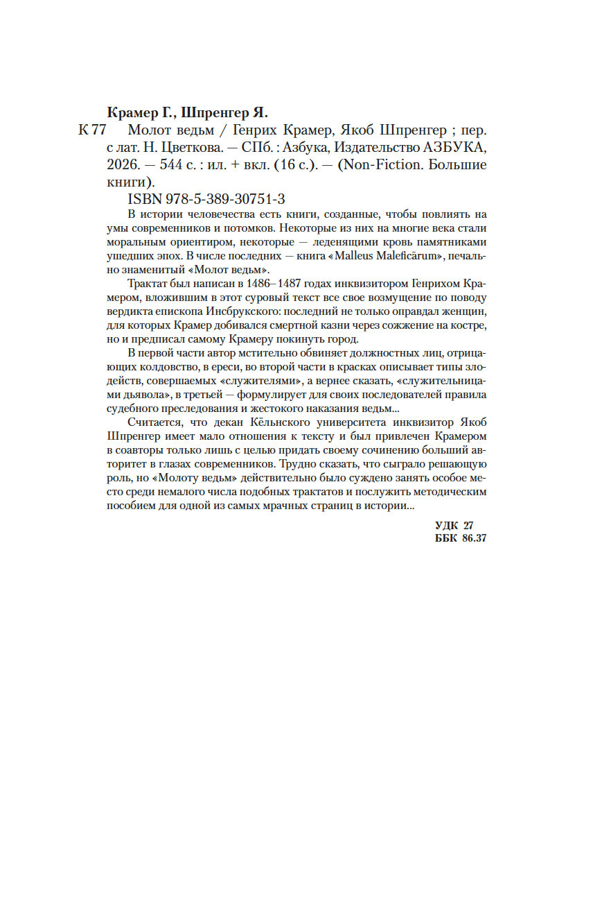 Считается, что декан Кёльнского университета инквизитор Якоб Шпренгер имеет мало отношения к тексту и был привлечен Крамером в соавторы только лишь с целью придать своему сочинению больший авторитет в глазах современников. Трудно сказать, что сыграло решающую роль, но "Молоту ведьм" действительно было суждено занять особое место среди немалого числа подобных трактатов и послужить методическим пособием для одной из самых мрачных страниц в истории...