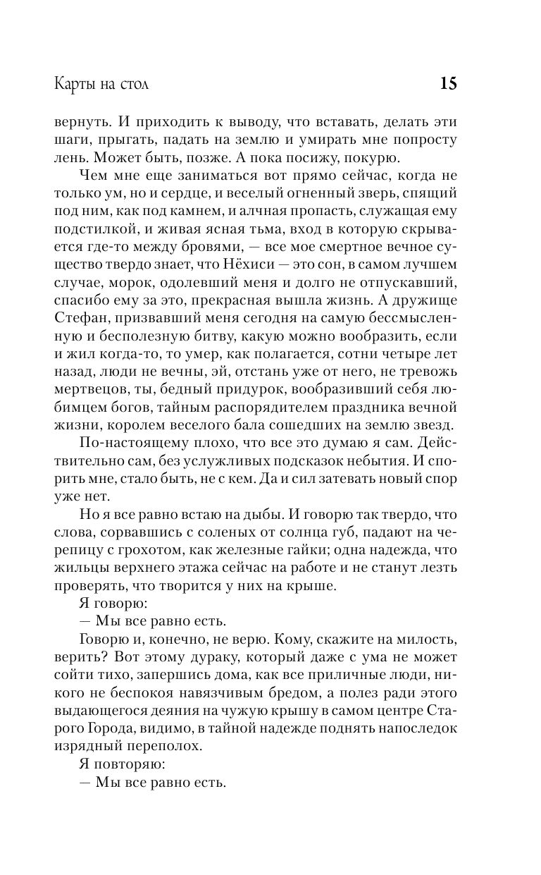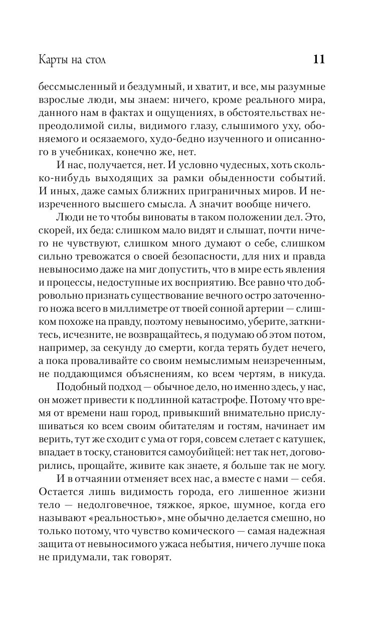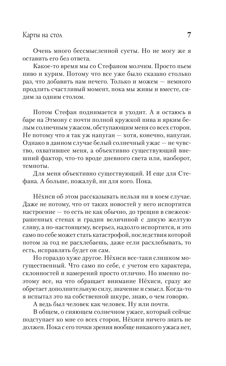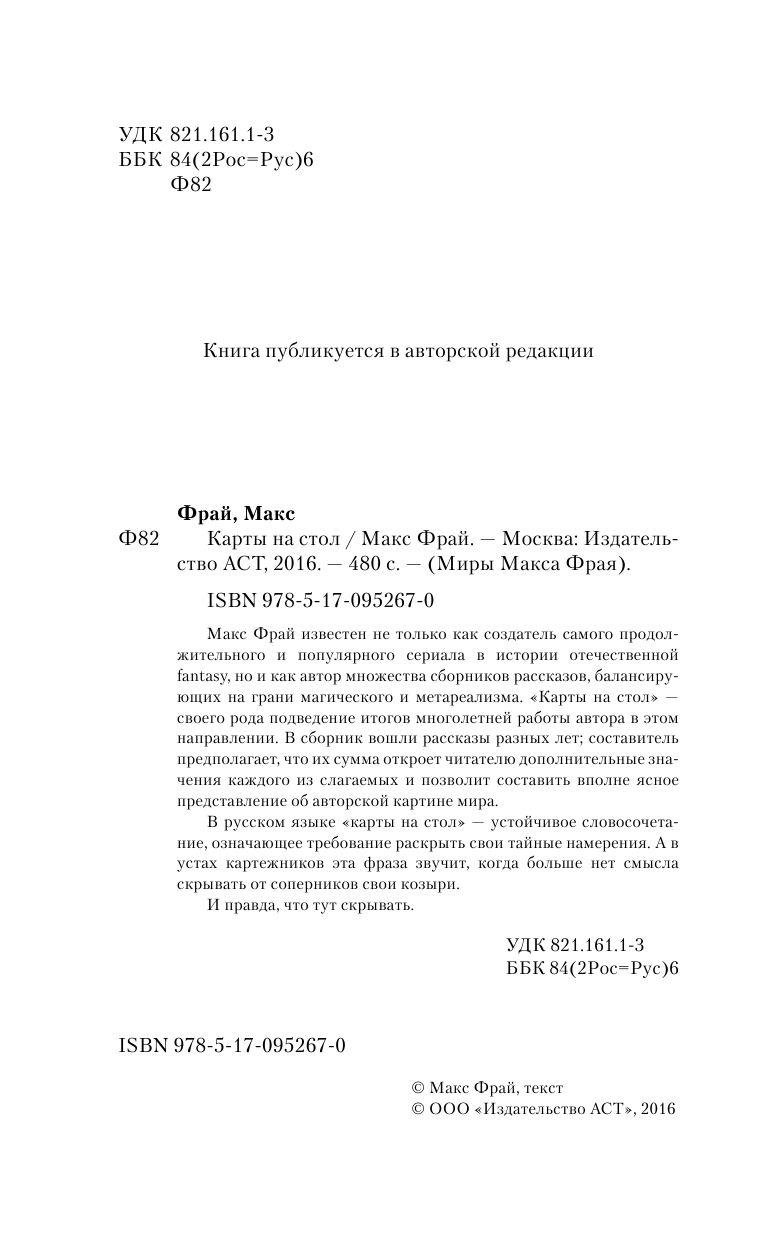 Макс Фрай известен не только как создатель самого продолжительного и популярного сериала в истории отечественной fantasy, но и как автор множества сборников рассказов, балансирующих на грани магического и метареализма. "Карты на стол" – своего рода подведение итогов многолетней работы автора в этом направлении. В сборник вошли рассказы разных лет; составитель предполагает, что их сумма откроет читателю дополнительные значения каждого из слагаемых и позволит составить вполне ясное представление об авторской картине мира.