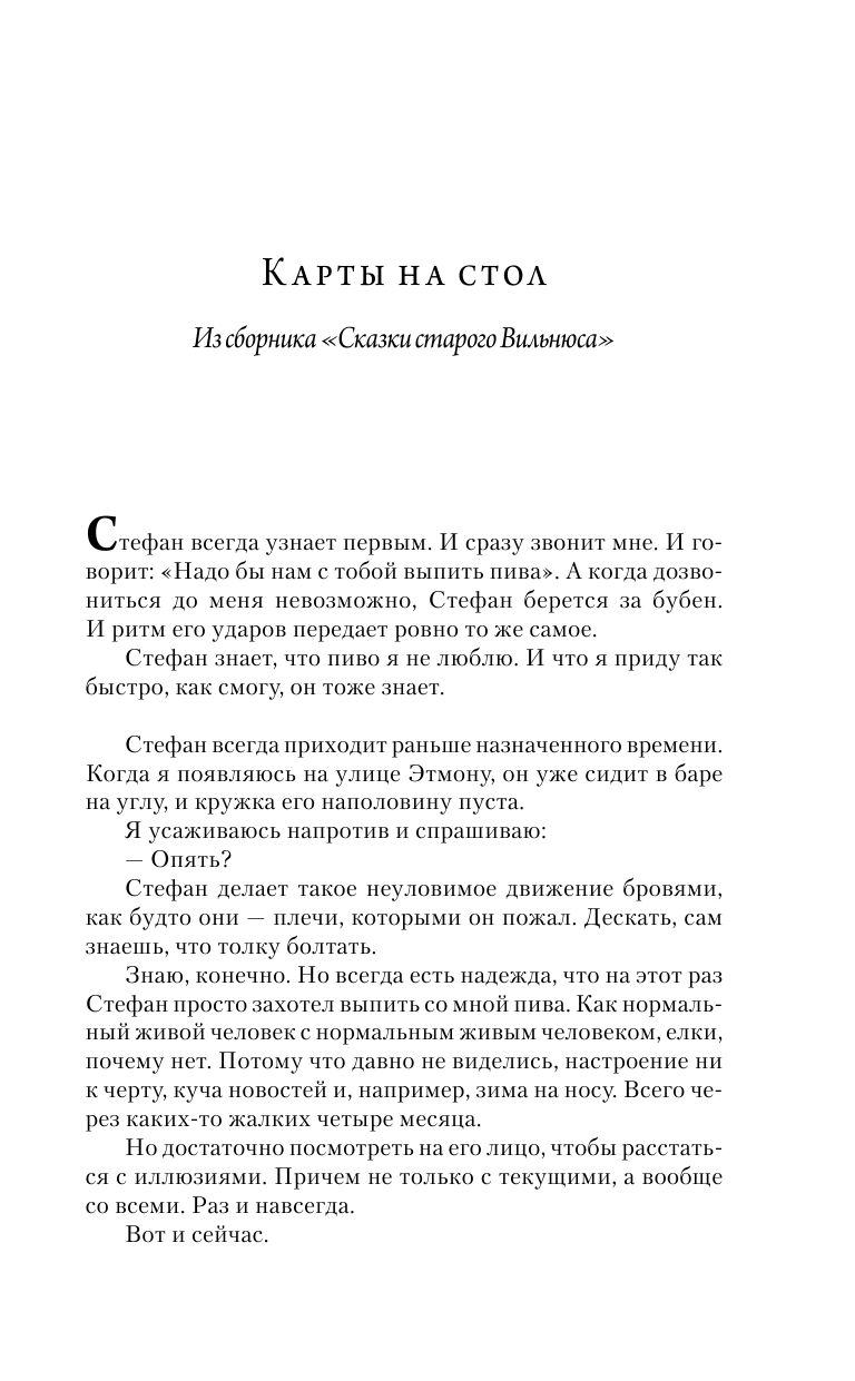 Все рассказы (кроме 15-страничного "Голова и Лира плыли по Гебру") уже были опубликованы ранее в других сборниках (Сказки старого Вильнюса, Большая телега, Ветры, ангелы и люди, Книга предложений, Прокотиков, О любви и смерти, Сказки и истории, Первая линия). Так что книга еще до покупки оказалась прочитана на 97%. Даже немного обидно. Но сборник хороший, тут ничего не скажешь.