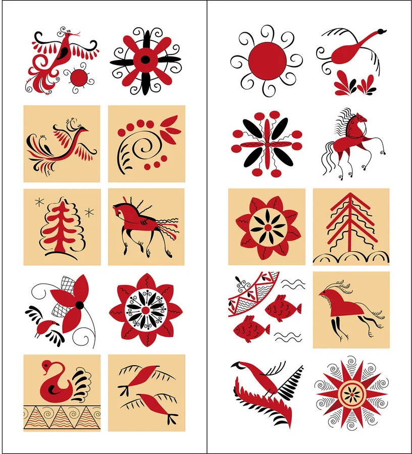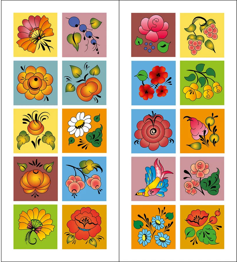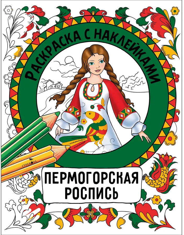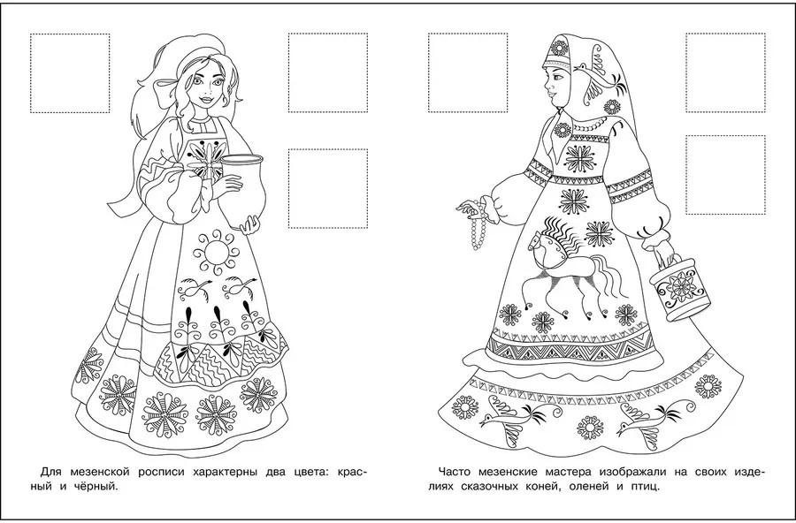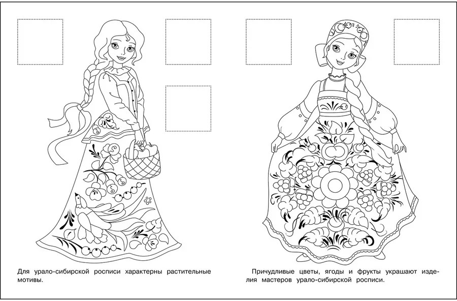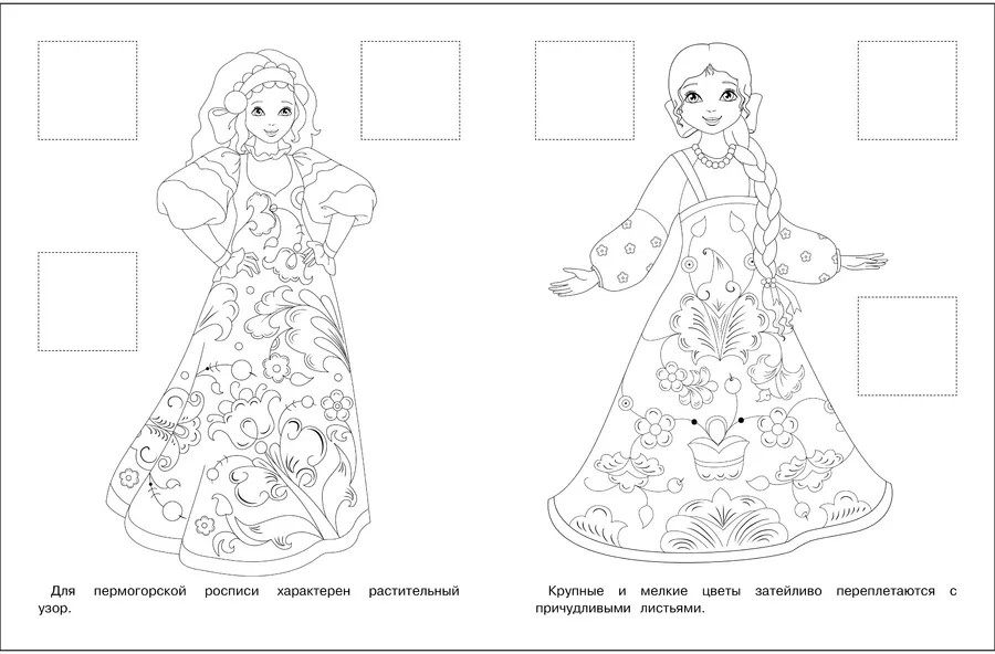 Комплект состоит из четырёх выпусков : Пермогорская роспись, Урало-Сибирская роспись, Хохломская роспись и Мезенская роспись. На страницах наших раскрасок русские красавицы познакомят ребенка с великолепными народными росписями. Маленькие художники смогут раскрасить узоры на платьях и узнать об истории росписей, их основных элементах и традиционных цветовых гаммах. А наклейки подскажут, как раскрасить картинки. Наклейки можно приклеить на страницы книжки, а можно украсить ими тетрадки или предметы в детской.