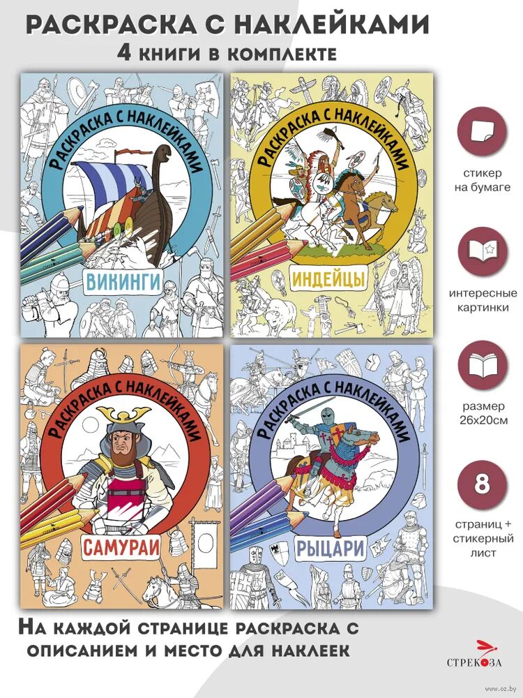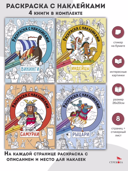 Комплект состоит из четырёх выпусков : " Викинги", "Индейцы", "Самураи", "Рыцари". Наклейки подскажут, как раскрасить картинки. Наклейки можно приклеить на страницы книжки, а можно украсить ими тетрадки или предметы в детской. Для детей младшего школьного возраста.