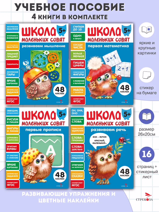 Издательство "Стрекоза" предлагает для родителей и педагогов комплект развивающих книг для детей 5+ серии "Школа маленьких совят". Комплект состоит из 4х пособий : "Первая математика", "Развиваем мышление", "Развиваем речь", "Первые прописи". В книге по математике представлены задания на сравнение чисел, на нахождение соседей числа, на состав числа, графические диктанты и многое другое. Она поможет отработать навыки количественного и порядкового счёта, изучить геометрические фигуры и тела, научиться решать простые примеры. В книге "Развиваем мышление"собраны такие задания как распутывание «верёвочки», подбор логических пар, нахождение лишних предметов, выполнение заданий на развитие пространственного мышления и т. д. Многие задания способствуют также развитию памяти и внимания. В пособии по развитию речи представлены задания на расширение активного словаря детей, на умение согласовывать слова в предложении и умение употреблять предлоги, задания на отработку правильного ударения в словах, которые наиболее часто вызывают затруднения у детей. Вы также найдёте в книге задания на составление диалогов, рассказов по картинкам, потренируются маленькие ученики и в пересказе любимых сказок. В прописях представлены различные задания: обведи элементы, дорисуй картинку, заштрихуй фрагменты картинки, нарисуй по клеткам и т. д.