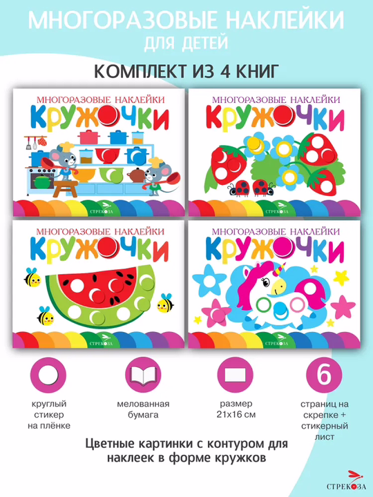 Запомнить названия цветов, развить мелкую моторику внимание и усидчивость помогут малышу наши многоразовые наклейки-кружочки. В каждой книжке 6 страниц + стик с 30 наклейками. Играйте с пользой!