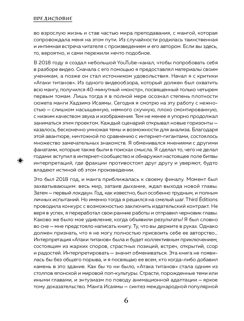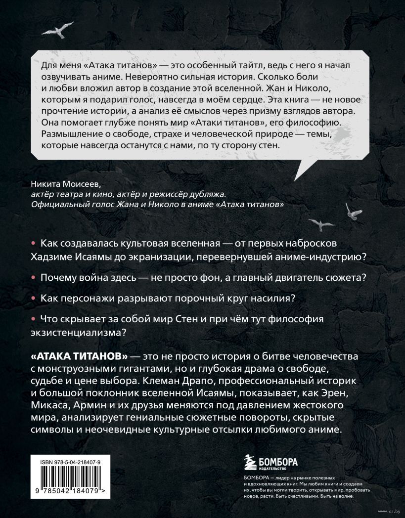 "Атака титанов" – это не только глобальный феномен поп-культуры, за несколько лет покоривший зрителей по всему миру, но и философский триллер о свободе, борьбе и человеческой природе. Автор, профессиональный историк и поклонник манги, анализирует многообразие образов, характеров и сюжетных арок, создающих уникальную вселенную Хадзимэ Исаямы. Вы узнаете, как "Атака титанов" повлияла на кино, литературу и фанатское движение и о том, какая философская подоплека стоит за ключевыми сюжетными поворотами.