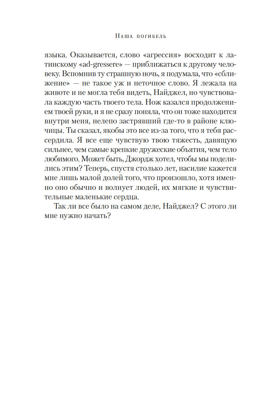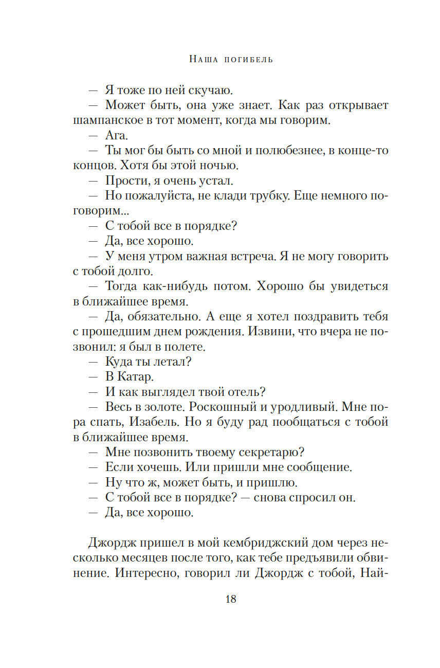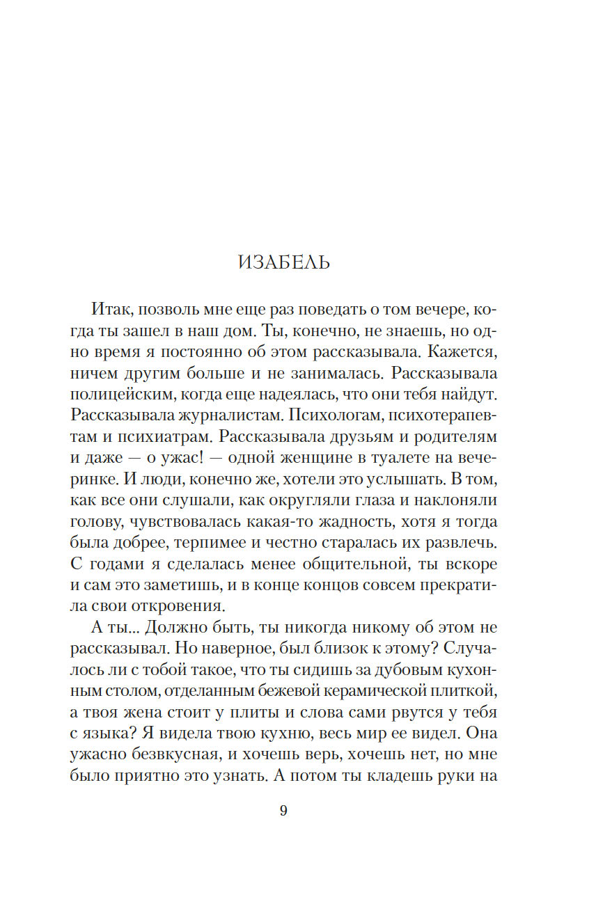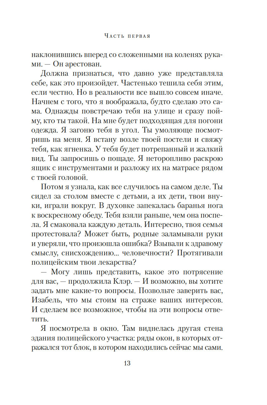 Готовясь выступить в суде, Изабель составляет подробные показания. И постепенно сквозь повествование, проникнутое ужасом и болью, проступает совсем другая история – история неидеальной, но подлинной любви, история жизни, полной ошибок, но стоящей каждого дня…
