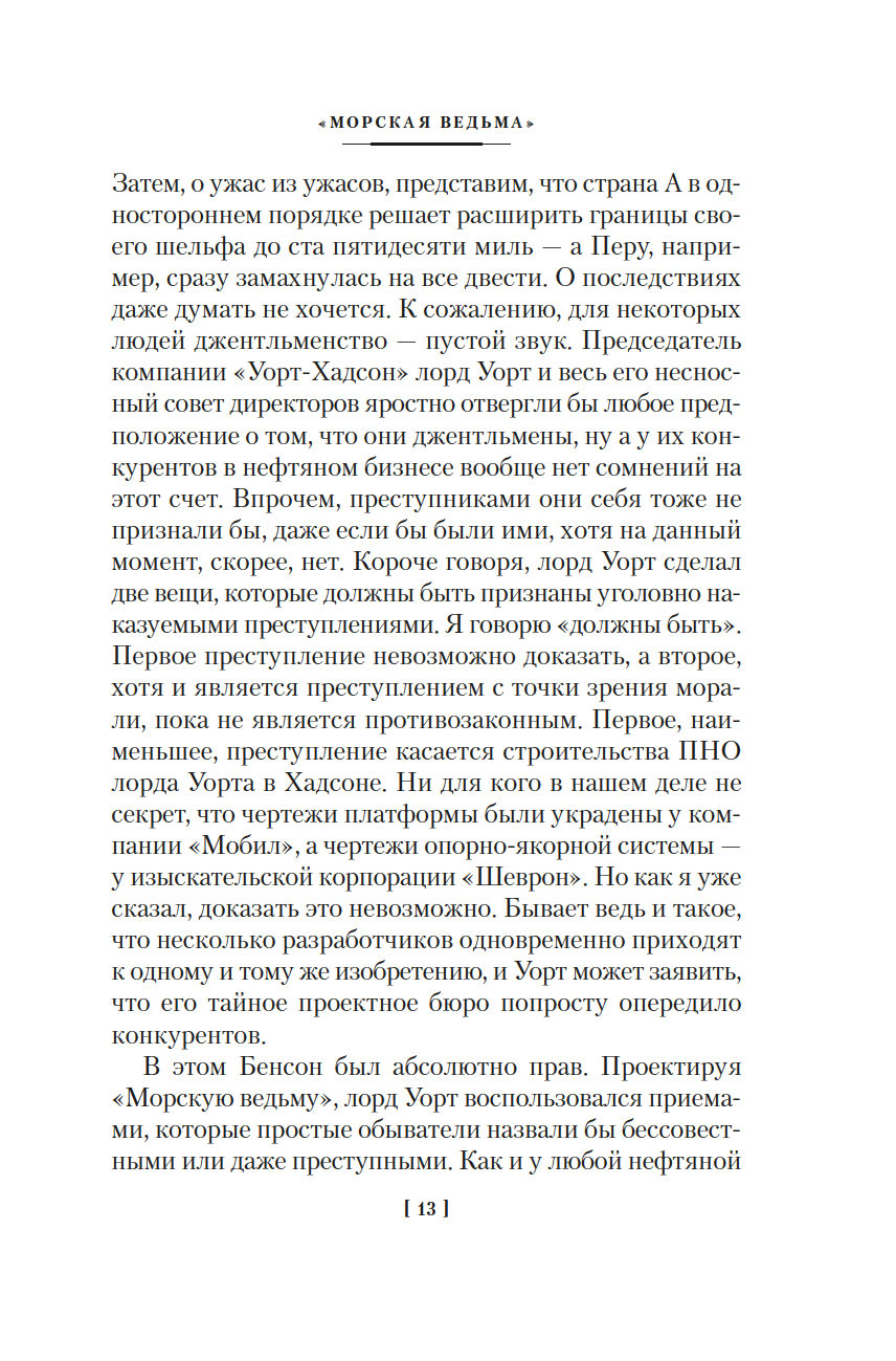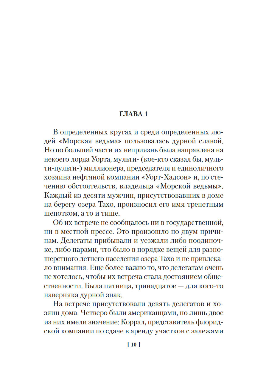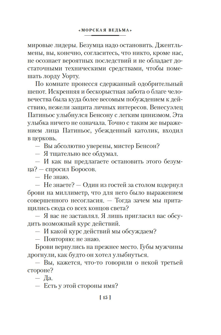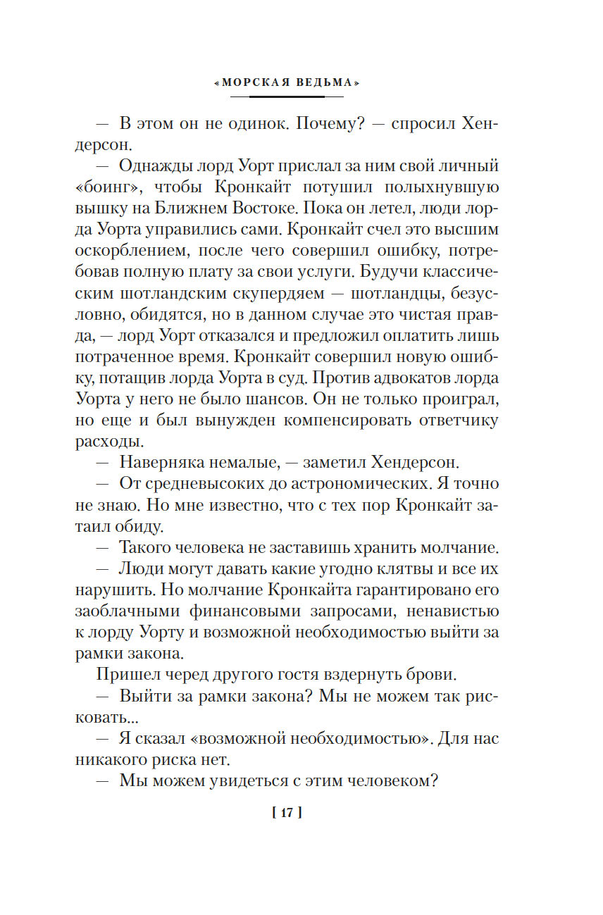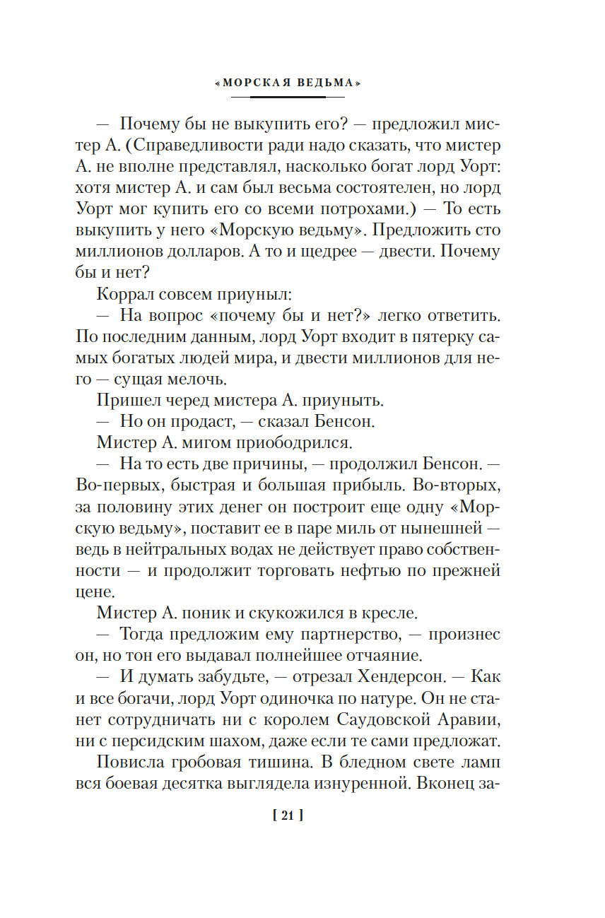 Уникальная нефтяная платформа под названием "Морская ведьма" – центр огромной империи, гордость владельца-миллиардера, хищного и безжалостного лорда Уорта. Теперь ему не страшны никакие конкуренты. Однако те не дремлют, и вскоре находится человек, желающий свести с Уортом личные счеты. Он похищает дочерей магната и выдвигает свои условия... Роман "Морская ведьма" стал бестселлером по версии "Нью-Йорк таймс".