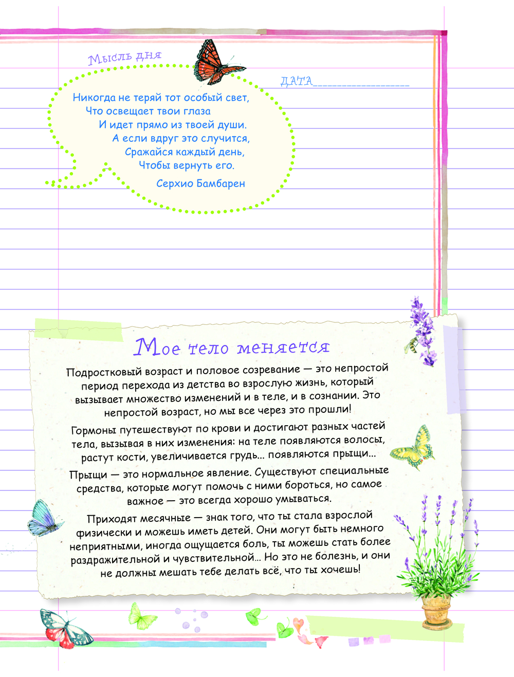 Если у тебя есть самый большой секрет, скорей открывай этот дневник и сохраняй его здесь! Пиши о своих самых сокровенных мыслях и чувствах, помни – здесь твой внутренний мир в безопасности.