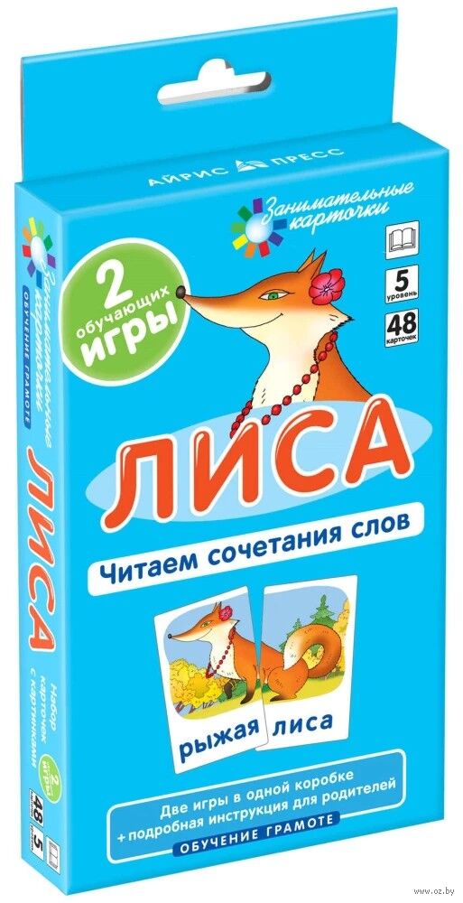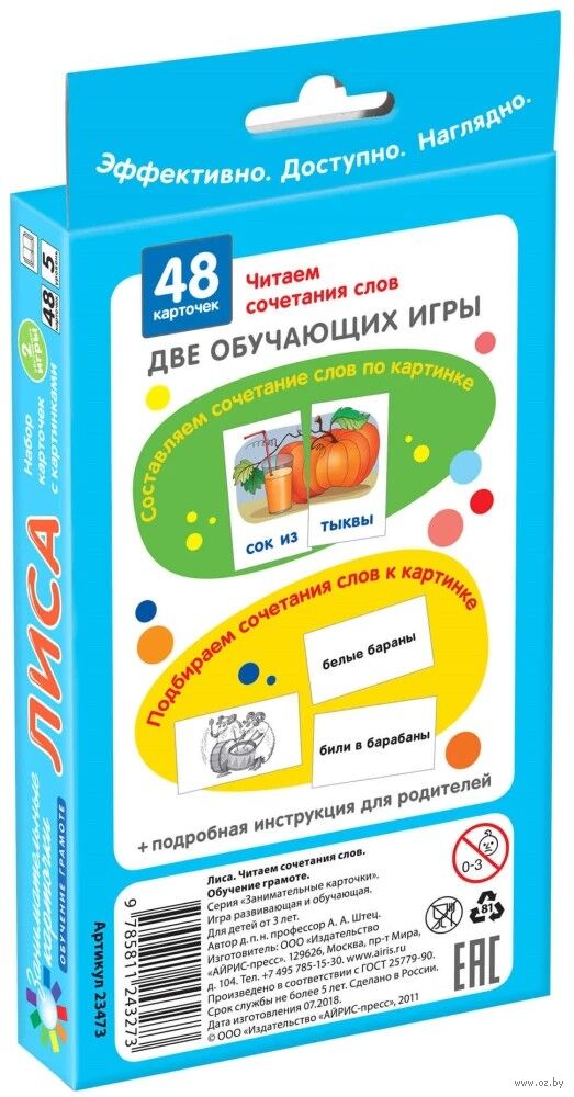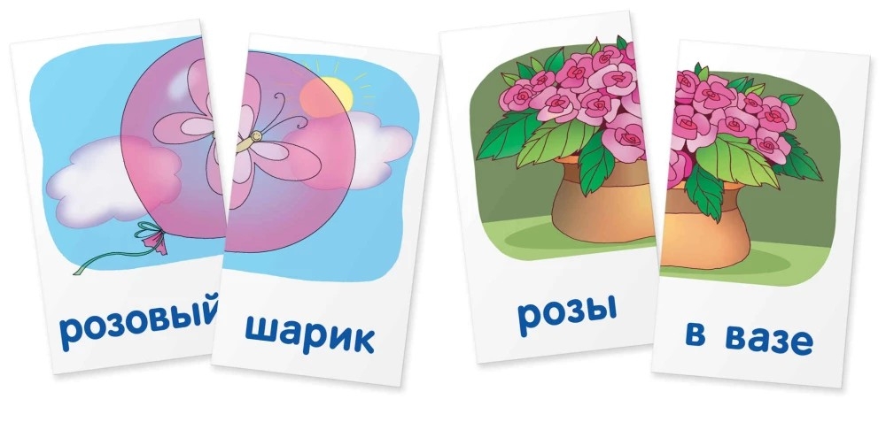 В данный набор входят 48 карточек, из которых можно составить 24 картинки. Если правильно собрать картинку, получится сочетание слов. В игре используется как лицевая сторона карточки, так и оборотная, что позволяет повысить эффективность обучения чтению.