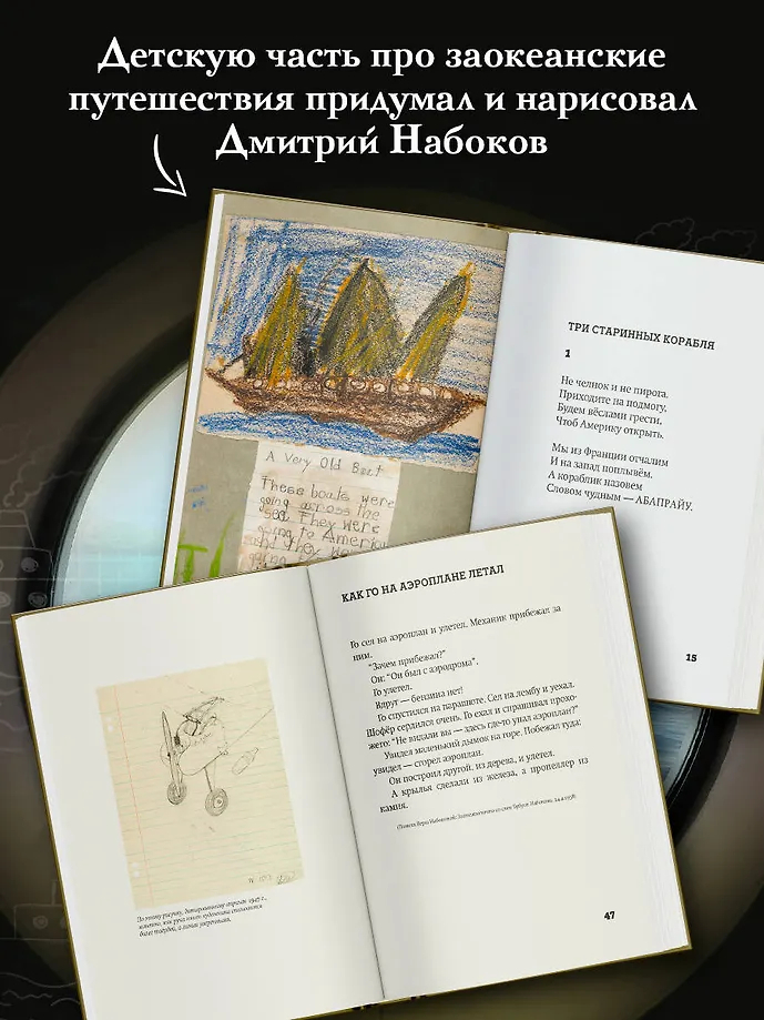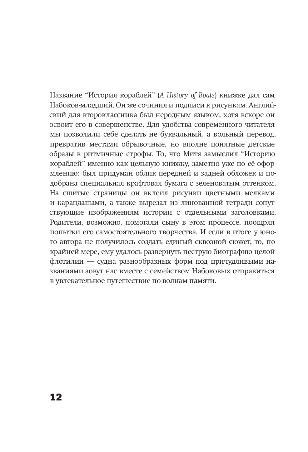 “История кораблей” – книга для детей и взрослых. Детскую часть про заокеанские путешествия придумал и нарисовал Дмитрий Набоков, сын великого русского писателя Владимира Набокова. Филолог Юрий Левинг перевёл историю на русский язык и снабдил увлекательным рассказом про мир настоящей техники.