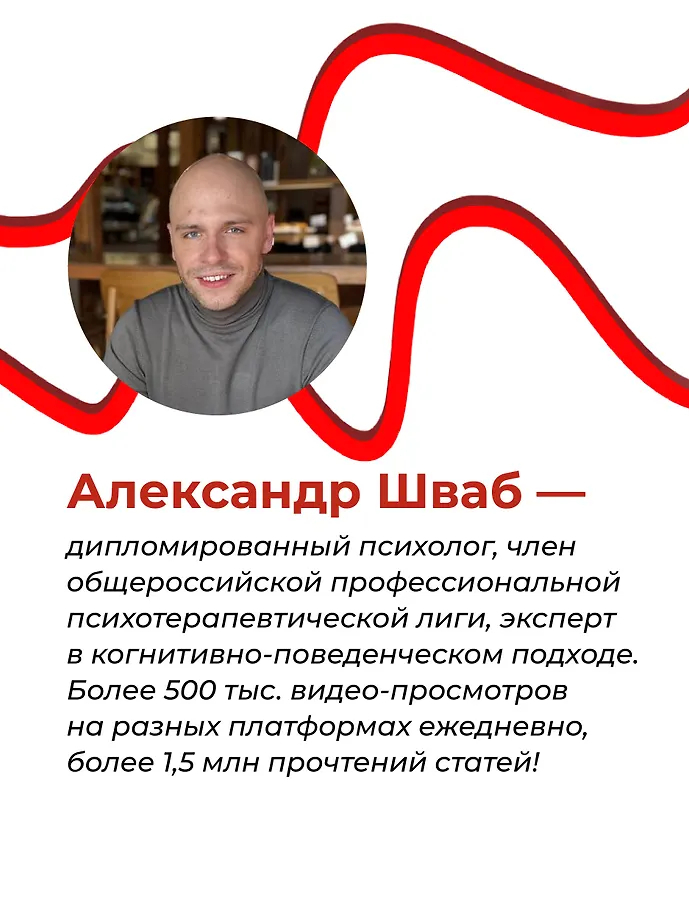Автор – Александр Шваб, дипломированный психолог, член общероссийской профессиональной психотерапевтической лиги, эксперт в когнитивно-поведенческом подходе. Более 500 тыс. видеопросмотров на разных платформах ежедневно, более 1,5 млн прочтений статей!