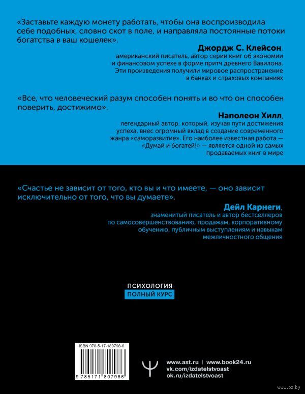 Книги Клейсона, Хилла и Карнеги – это уникальное сочетания идей и практических советов, которые помогут вам добиться успеха и карьерного роста, настроиться на деньги, понять законы их движения, накопления и сохранения, научат, как найти самые быстрые и эффективные пути к финансовому и личностному благополучию. Не упустите свой шанс стать богаче, как это уже сделали миллионы людей по всему миру!