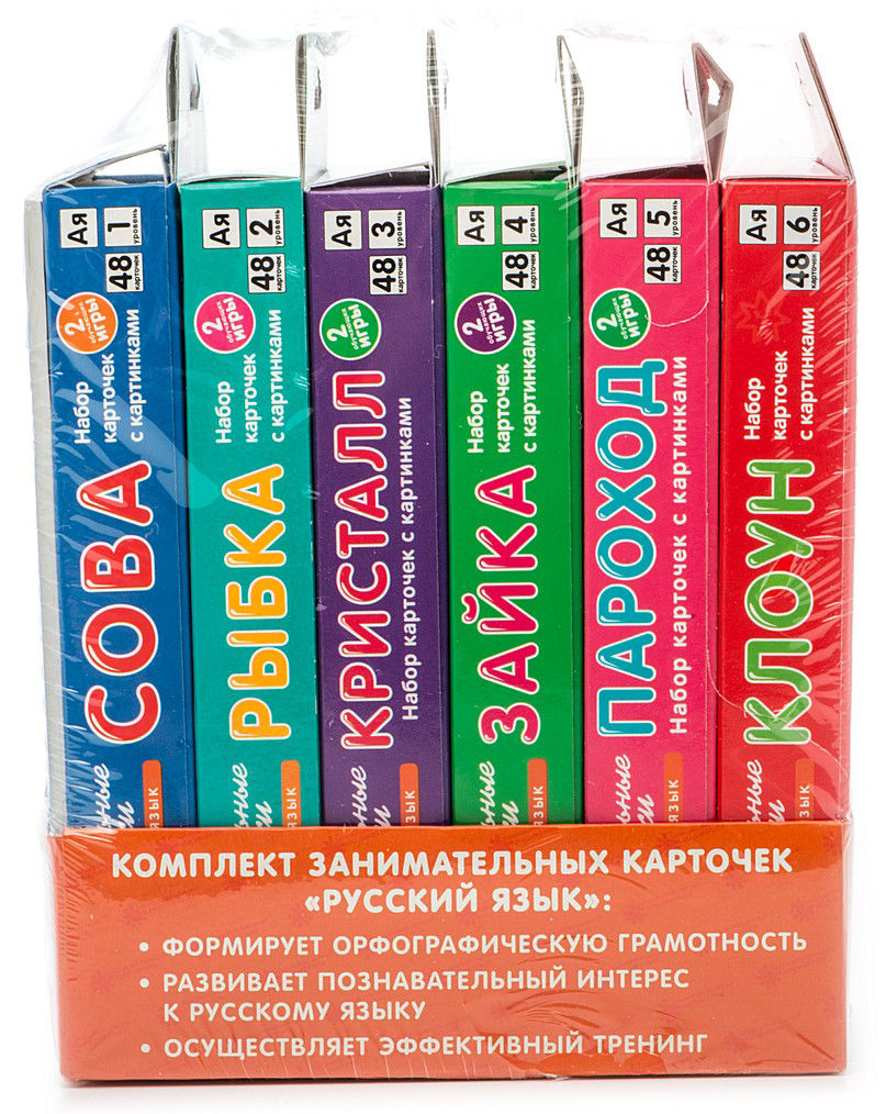 Комплект "Русский язык" включает в себя 6 наборов, каждый из которых содержит 48 цветных карточек с картинками, опорными таблицами, орфографическими моделями и тестовыми заданиями.