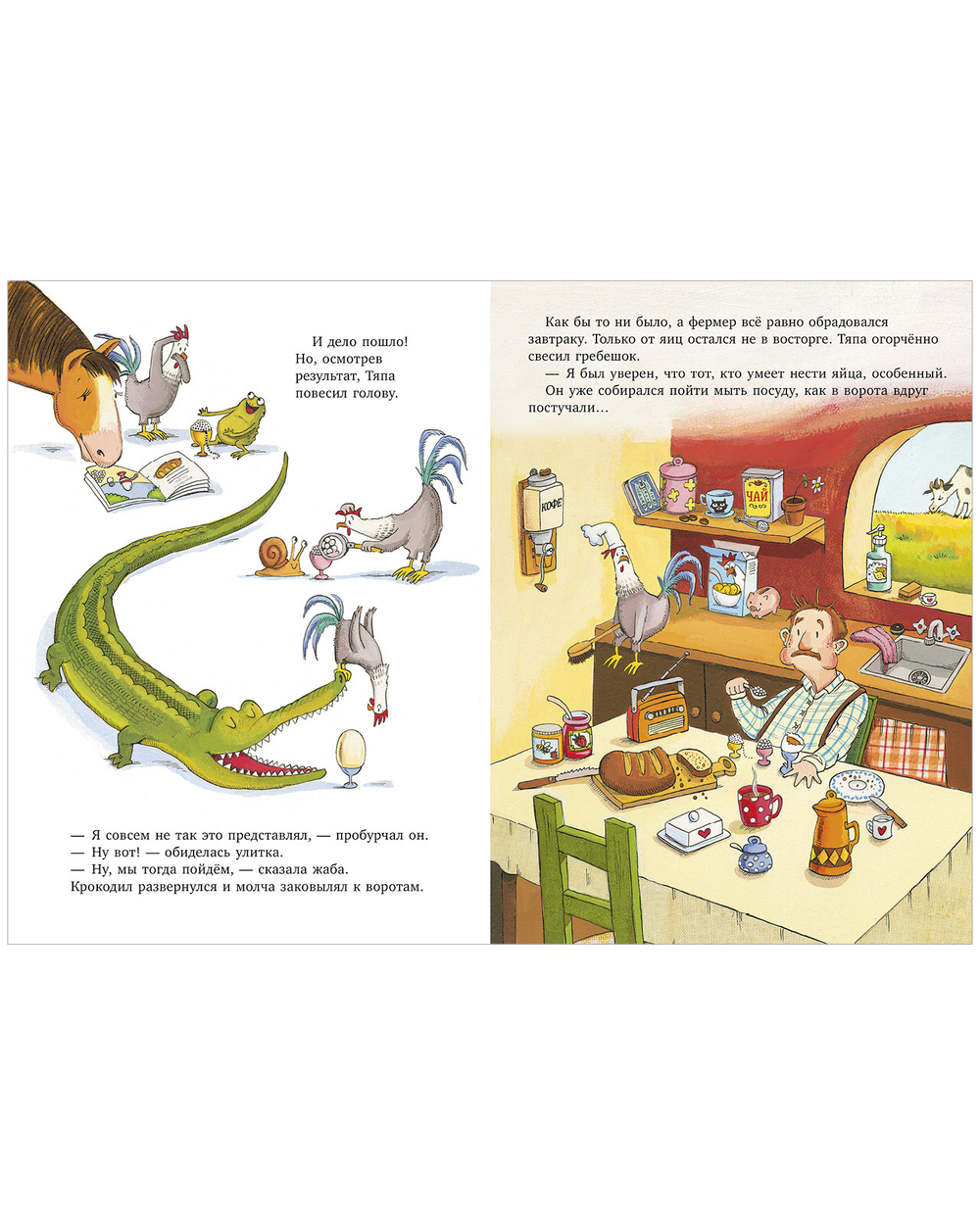 Петушок Тяпа просто обожает готовить: варить варенье, жарить оладьи и печь ароматный хлеб. Он мечтает приготовить большой фермерский завтрак, но… у него нет яйца. Что же делать? Тяпа дает объявление, даже не представляя, какие сюрпризы ждут его впереди.