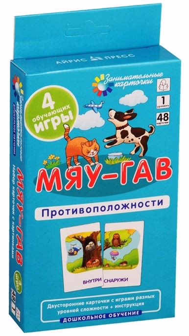 Игры с карточками "Мяу-гав" помогут развить пространственное мышление и восприятие, научат лучше понимать свойства предметов и их положение в окружающей обстановке. Чтобы ребёнок легче усвоил материал, обучение построено на умении различать противоположные понятия: большой-маленький, быстрый-медленный, громкий-тихий и т. п. Рисунки на чёрно-белой стороне карточек знакомят ребёнка с формами предметов.
