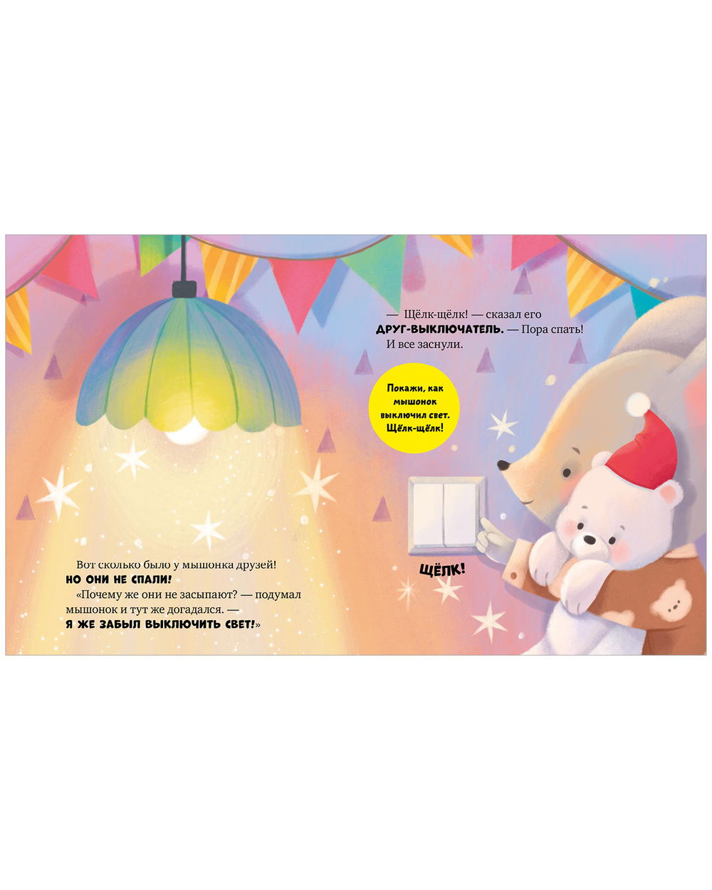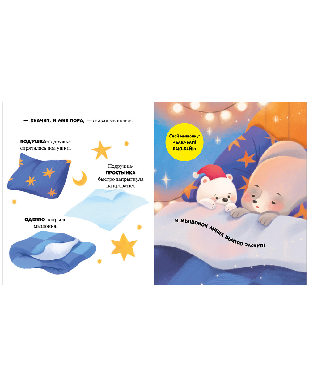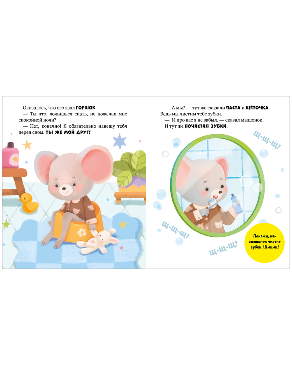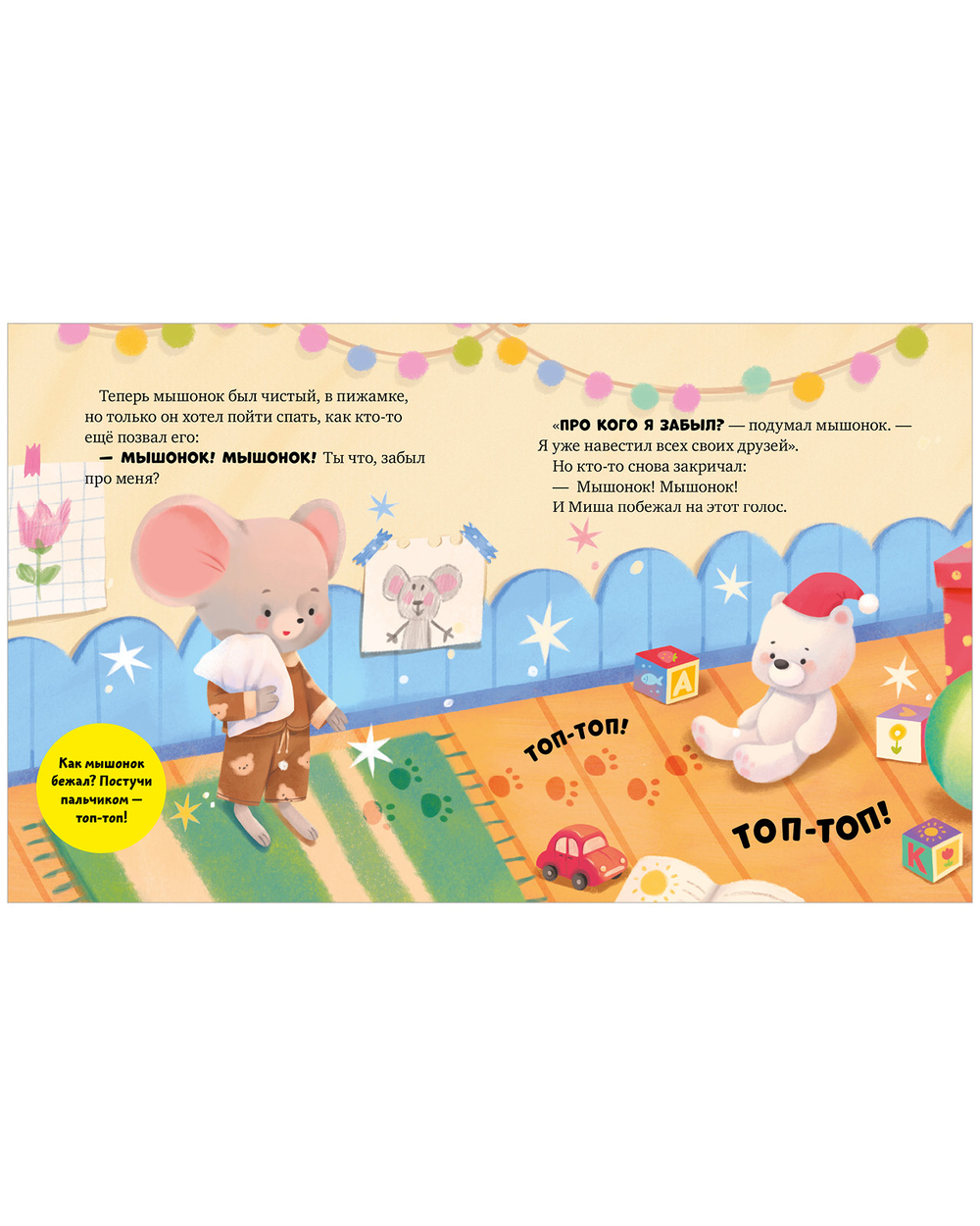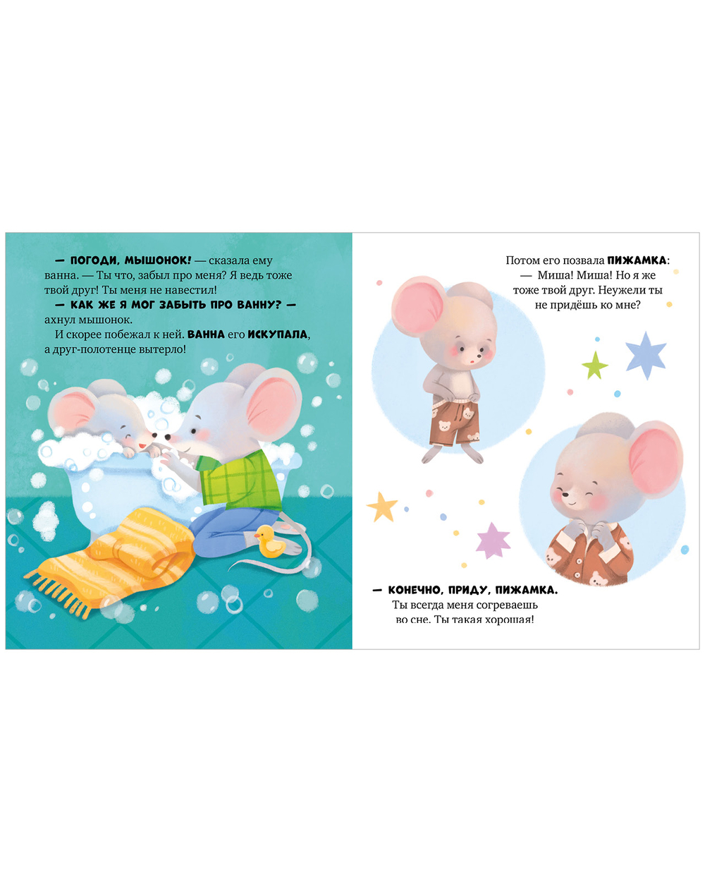 Вместе с мышонком Мишей ребенок узнает, что нужно делать каждый вечер, перед тем как лечь в кроватку: убрать игрушки, надеть пижаму, сходить на горшок и почистить зубы.