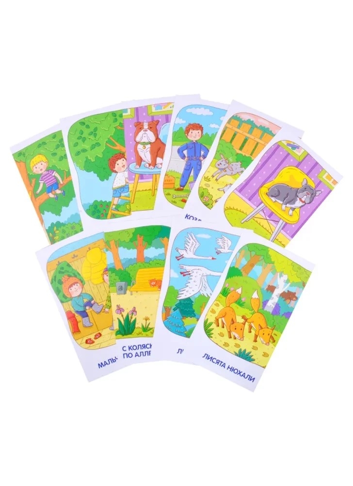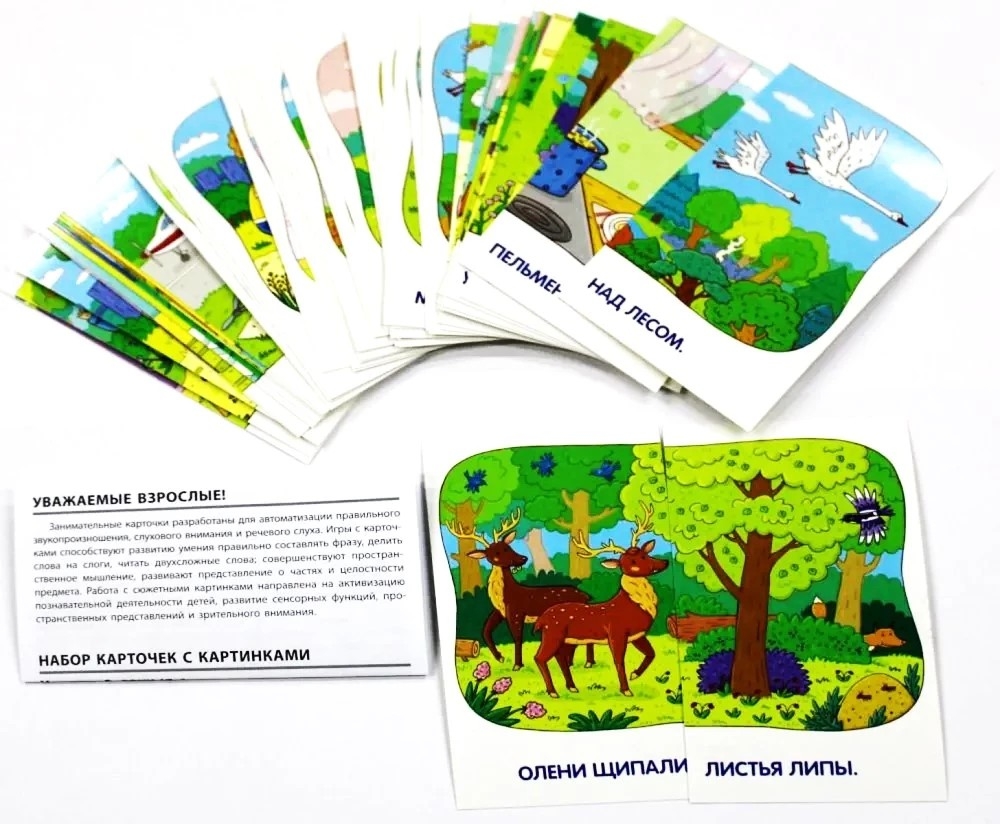 Игры с карточками способствуют развитию умения правильно составлять фразу, делить слова на слоги, читать двухсложные слова; совершенствуют пространственное мышление, развивают представление о частях и целостности предмета.