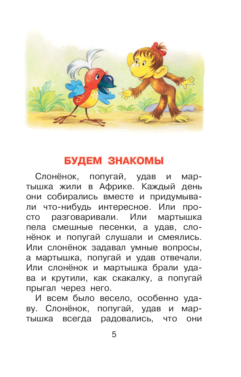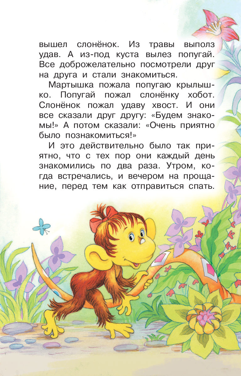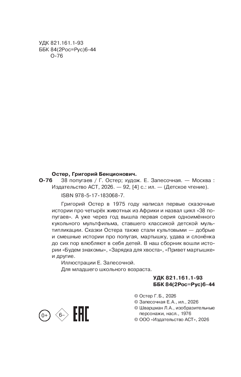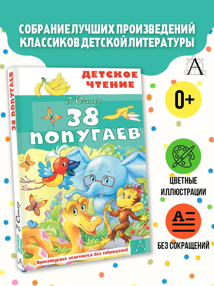 Григорий Остер в 1975 году написал первые сказочные истории про четырёх животных из Африки и назвал цикл "38 попугаев". А уже через год вышла первая серия одноимённого кукольного мультфильма, ставшего классикой детской мультипликации. Сказки Остера также стали культовыми – добрые и смешные истории про попугая, мартышку, удава и слонёнка до сих пор влюбляют в себя детей. В наш сборник вошли истории "Будем знакомы", "Зарядка для хвоста", "Привет мартышке" и другие.