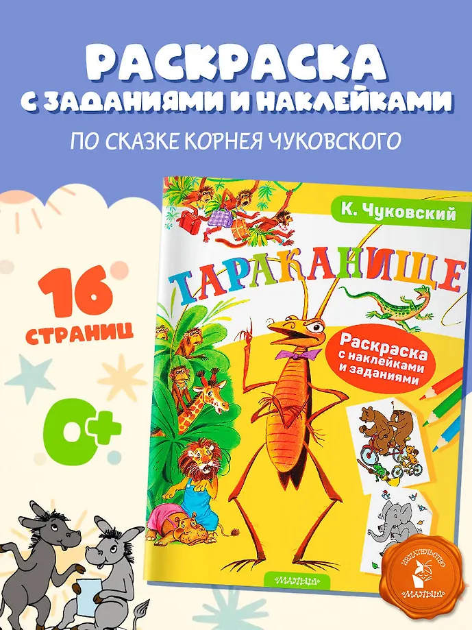 Увлекательная раскраска с наклейками и развивающими заданиями по знаменитой сказке Корнея Чуковского "Тараканище" станет замечательным подарком для вашего ребёнка. Наклеивая яркие