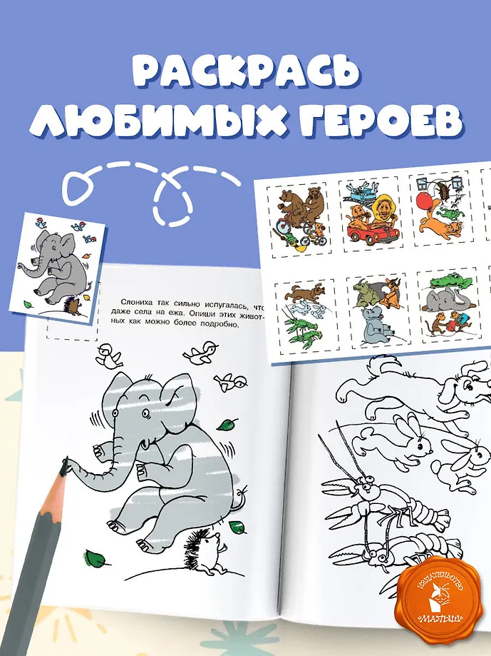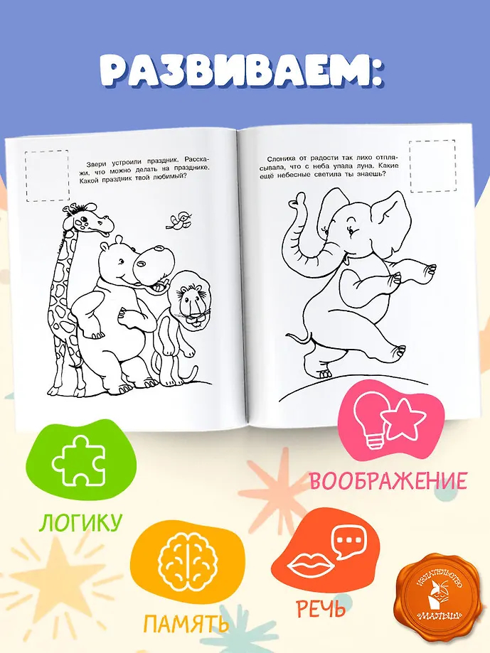 наклейки и раскрашивая забавные картинки, ребёнок будет развивать внимание и мелкую моторику. Задания помогут тренировать логическое мышление, навыки счёта и память, а также расширять словарный запас.