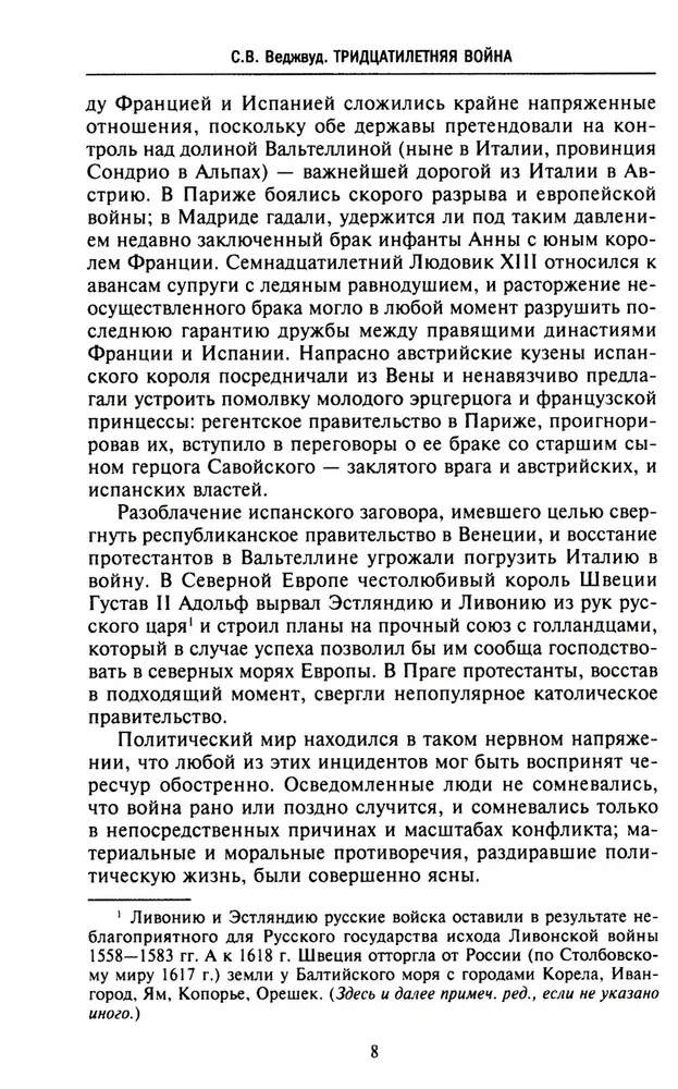 С. В. Веджвуд – автор целого ряда трудов о Европе XVII в. и один из самых известных и популярных историков Великобритании, представляет исчерпывающую хронику Тридцатилетней войны с ее основными битвами и главными участниками. Живыми и яркими красками она изображает Европу 1618 г., раздираемую противоречиями между католиками и протестантами; Бурбонами и Габсбургами; между империями, королевствами и бесчисленными мелкими государствами. После того как разгневанные протестанты выбросили трех представителей Священной Римской империи из окон королевского замка в Праге, вспыхнуло восстание, и война начала неумолимо расползаться из Богемии по всей Европе, вовлекая страны от Испании до Швеции в кошмарную карусель голода, эпидемий и бесконечного хаоса.
