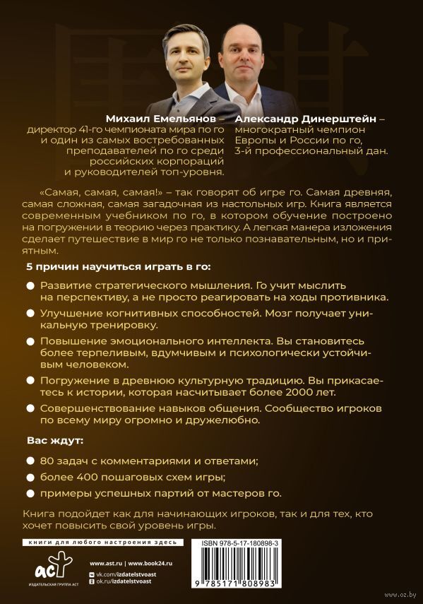 В своем пособии они поделились хитростями и приемами для победы в игре го, которыми пользуются настоящие мастера. Обучение игроков построено на погружении в теорию через практику. Это позволяет даже новичкам за короткое время освоить сложные правила древнейшей стратегической игры.