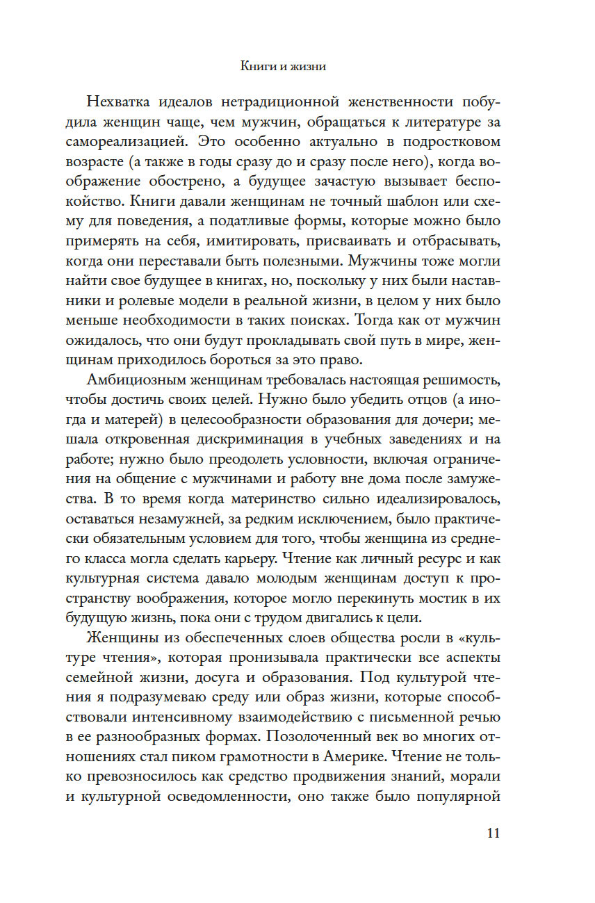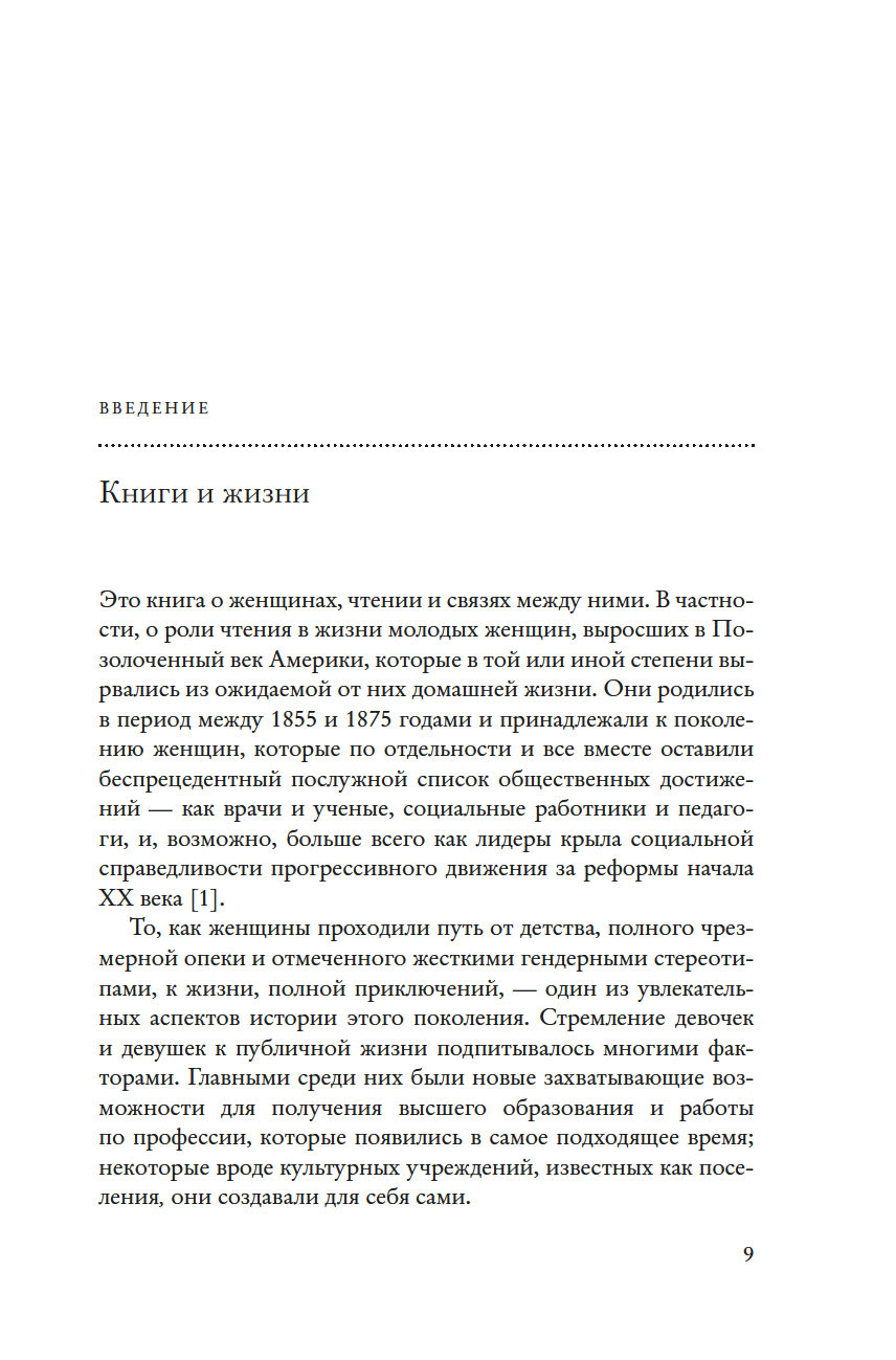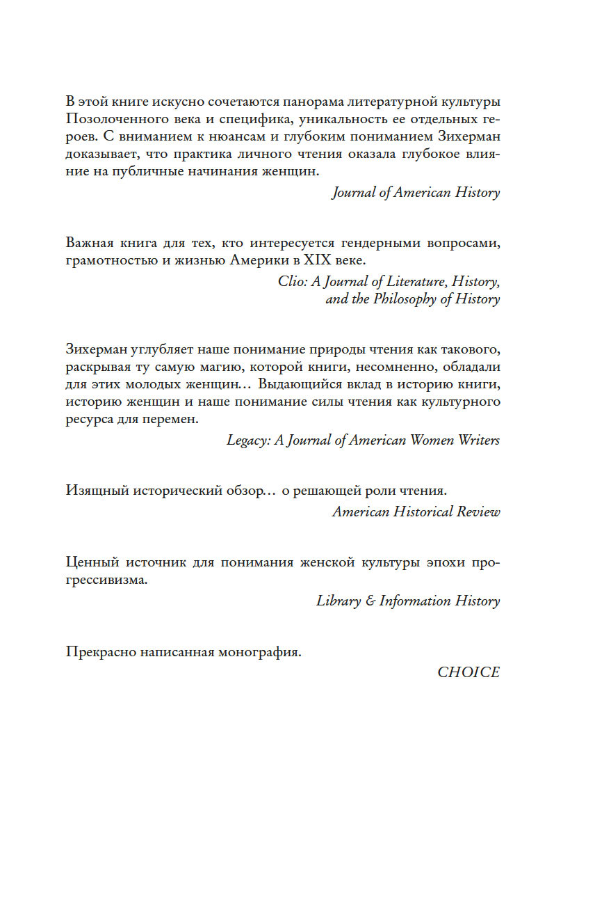 Историк и специалист в области гендерных исследований Барбара Зихерман предлагает новый взгляд на книжную и интеллектуальную культуру Позолоченного века и на удивительных женщин, которые ее творили. В своей работе Зихерман глубоко исследует роль литературы в судьбах женщин конца XIX – начала XX века – их образование, досуг, круг чтения. Они ходили в читальные залы для женщин и открывали их, организовывали литературные кружки и благодаря книгам обретали себя – как интеллектуалки и педагоги, исследовательницы и социальные реформаторы, меняющие мир.