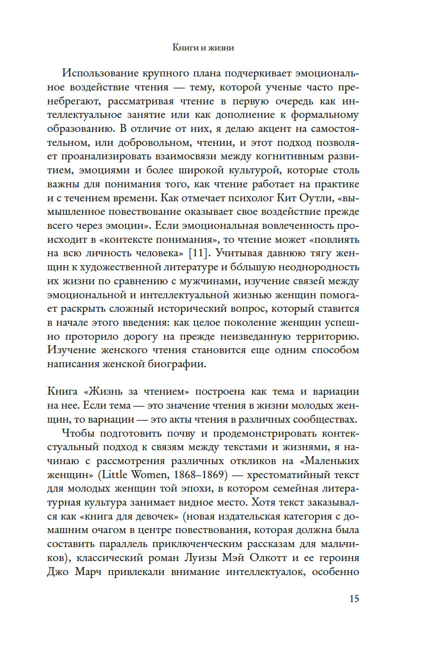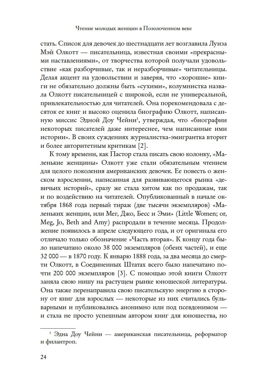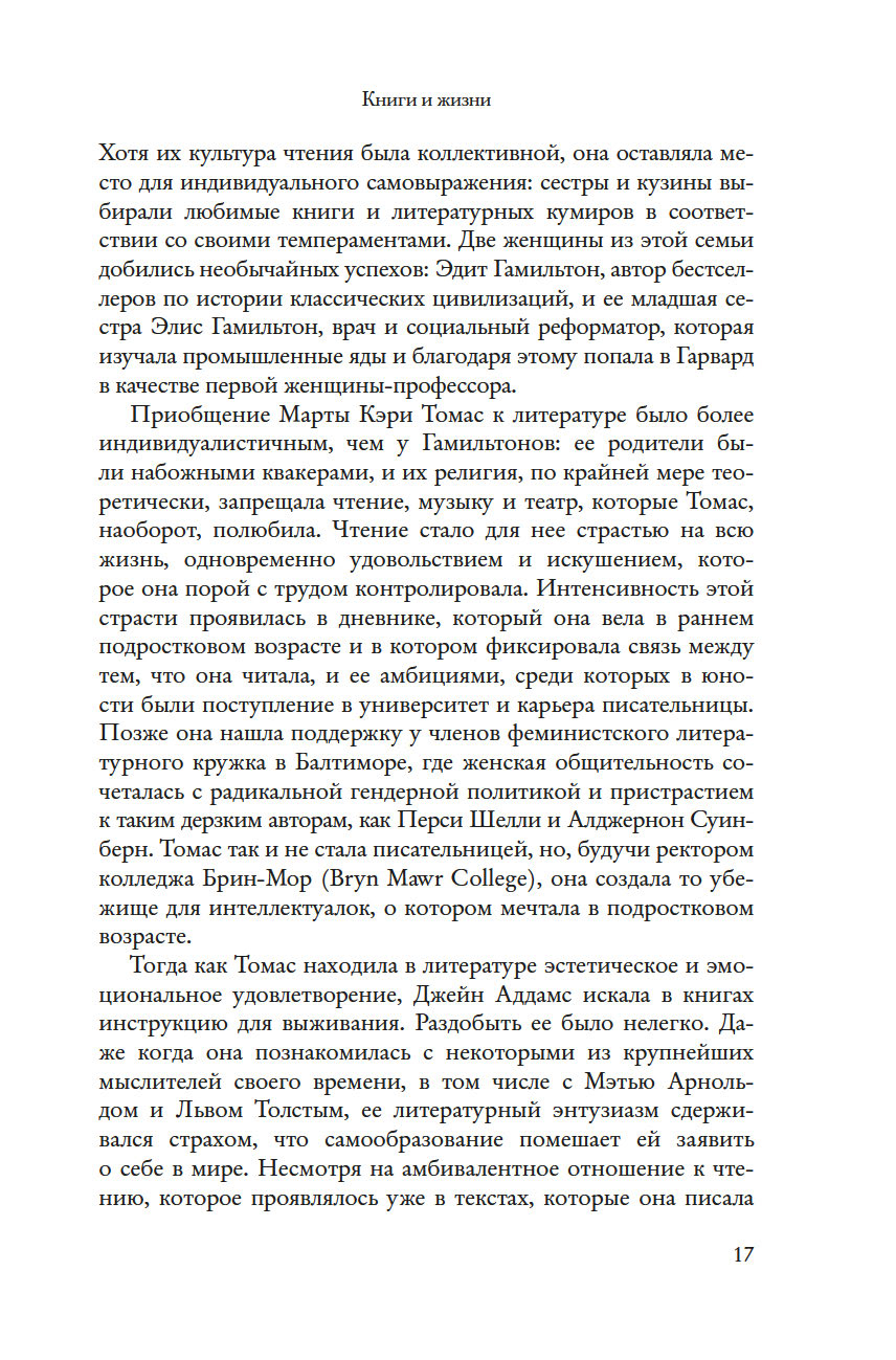 Девочки и женщины Позолоченного века находили и теряли себя в книгах. Чтение было учебой и игрой, дисциплиной и освобождением, интеллектуальным удовольствием и вдохновением для творчества, эскапизмом и способом провести время с семьей. Как чтение стало культурным образом жизни, а роман "Маленькие женщины" – обрядом взросления для целого поколения девочек-подростков? Почему библиотеки воспринимались как символ свободы? Как любовь к литературе пробуждала амбиции и воображение? Филолог-классик Эдит Гамильтон и врач Элис Гамильтон выросли, окруженные книгами. Религия семьи Марты Кэри Томас запрещала чтение, однако книги стали ее главной страстью – ее главным удовольствием и искушением. Афроамериканка Ида Белл Уэллс родилась в рабстве, и умение обращаться со словами стало ее пропуском в мир в качестве педагога и журналистки.