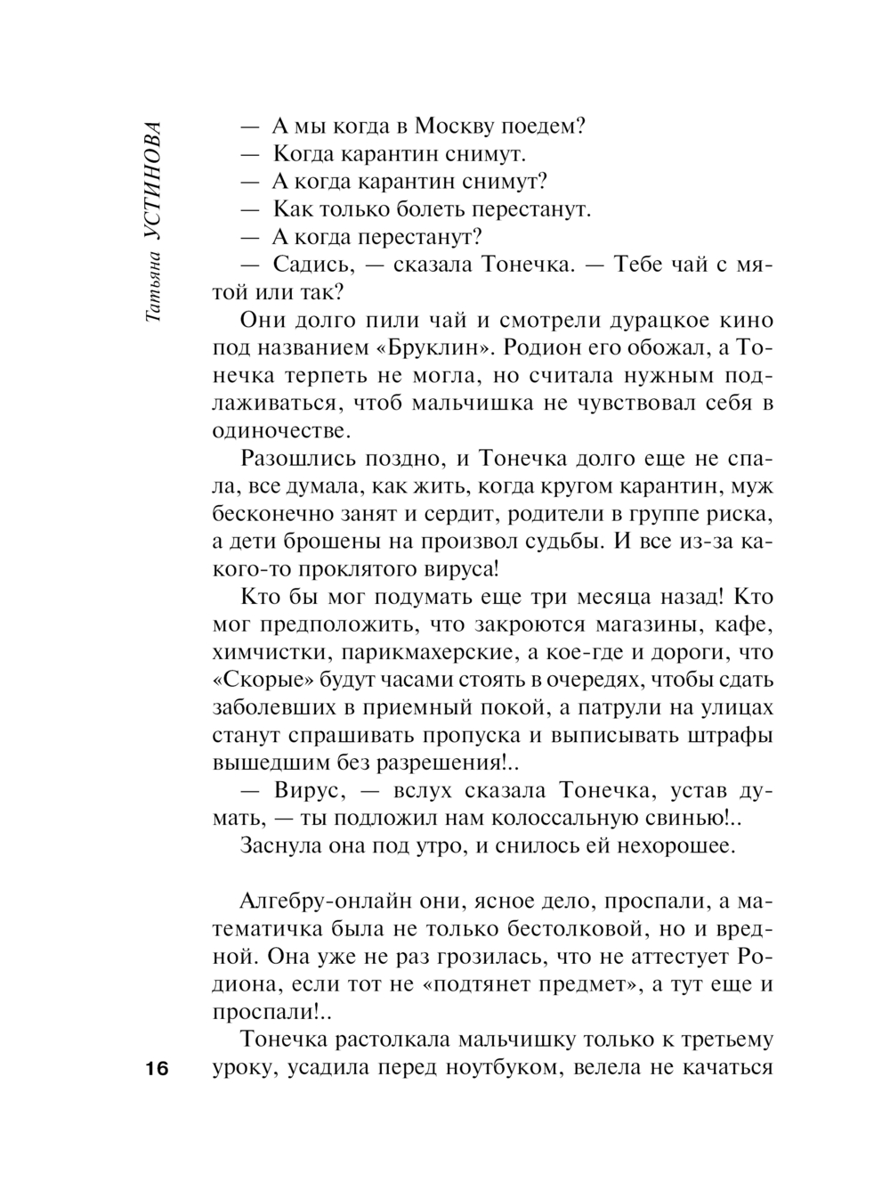 Когда в одночасье вся жизнь переменилась: закрылись университеты, не идут спектакли, дети теперь учатся на удаленке, и из Москвы разъезжаются те, кому есть куда ехать, Тонечка – деловая, бодрая и жизнерадостная сценаристка, и ее приемный сын Родион – страшный разгильдяй и недотепа, но еще и художник, оказываются вдвоем в милом городе Дождеве.