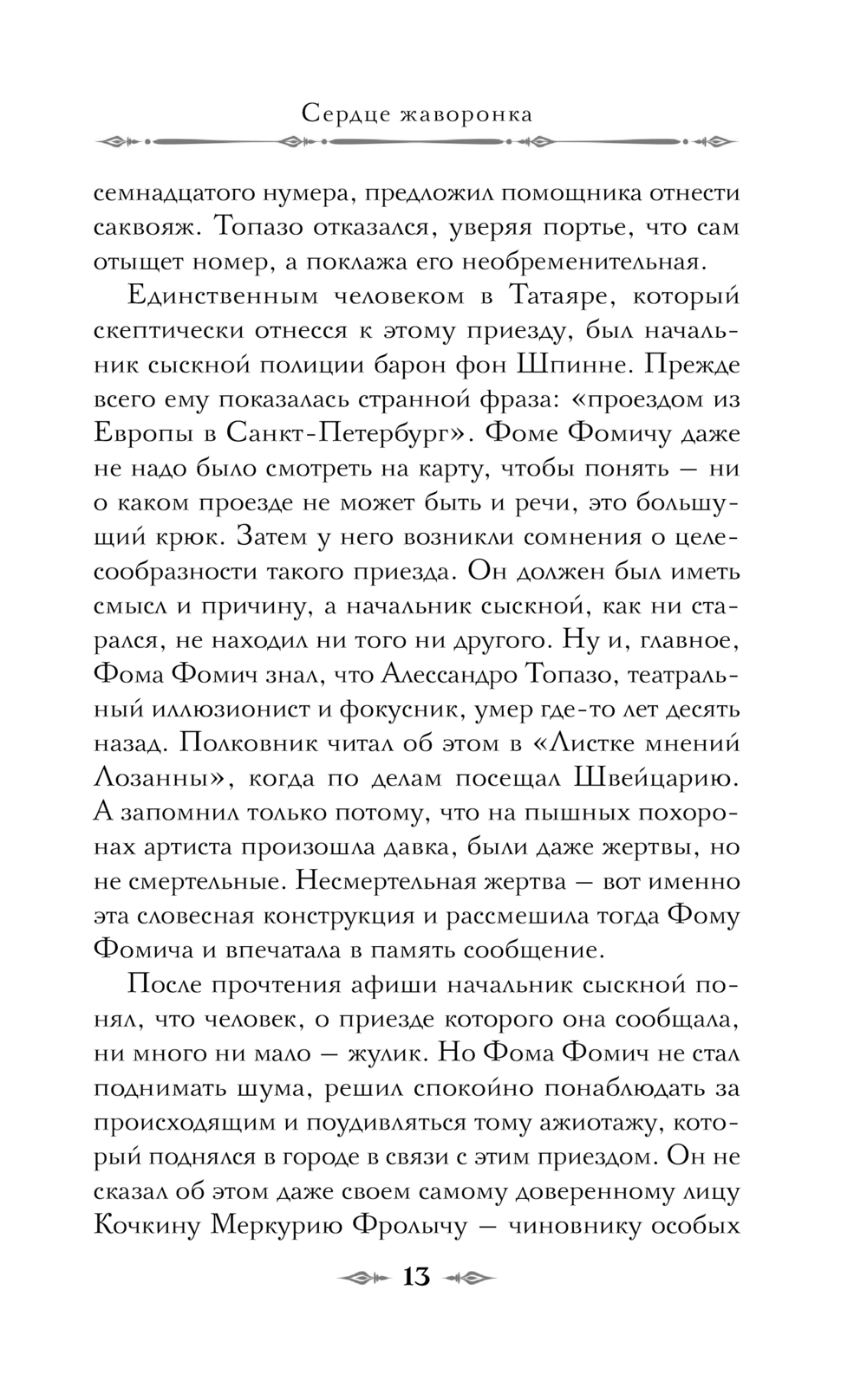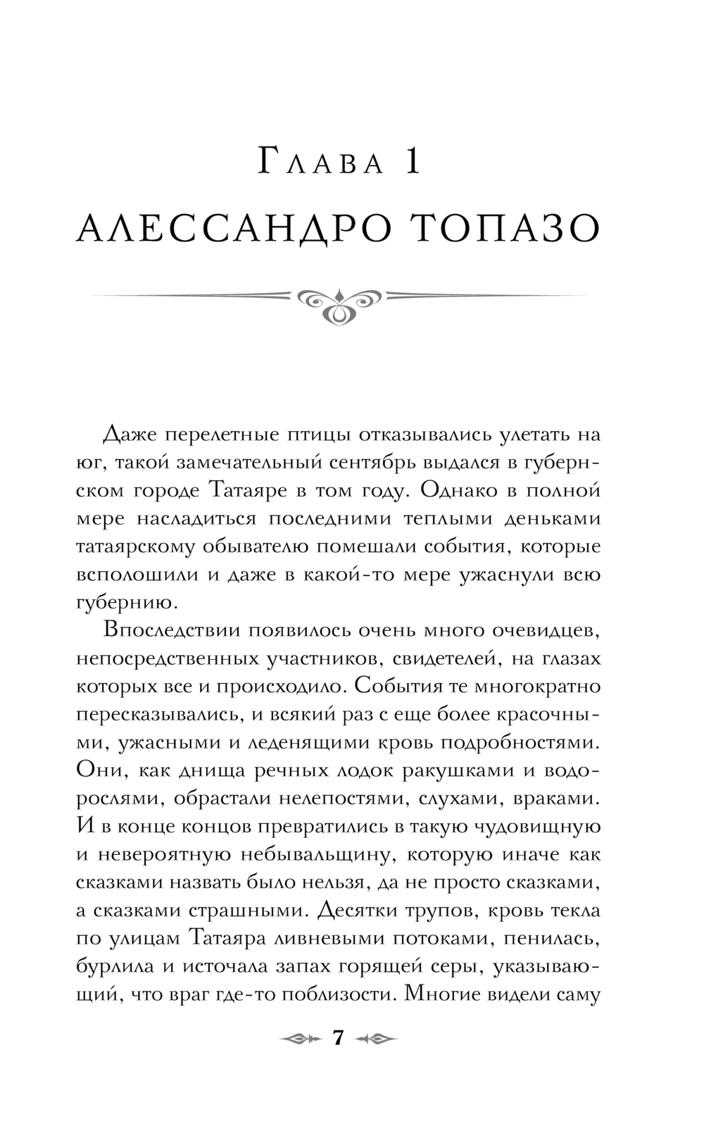 В губернском городе Татаяре необычное волнение: приезжает всемирно известный предсказатель и иллюзионист Алессандро Топазо. Его выступление в местном театре собирает полный зал, а на званом ужине у губернатора он поражает гостей странным фокусом – вырывает "живое сердце" из чучела птицы, стоявшего на камине.
