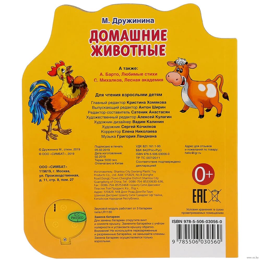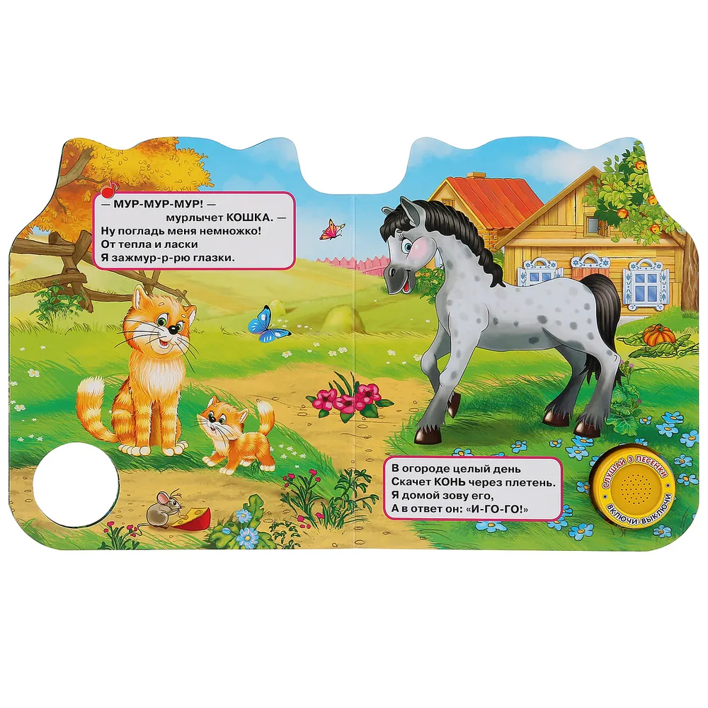 Ребёнок с удовольствием будет листать плотные страницы, рассматривать яркие картинки, вместе с родителями читать добрые стихи про животных и слушать мелодичные песенки, знакомясь таким образом с окружающим миром. Малыш легко освоит включение звука: по нажатию на кнопку песенка включится, при втором нажатии выключится, при третьем – заиграет следующая композиция и т.д. Благодаря компактному размеру книгу удобно взять с собой в дорогу.