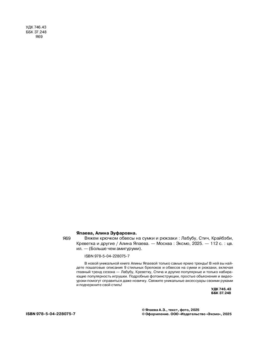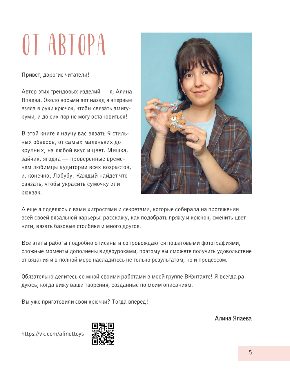 В новой уникальной книге Алины Япаевой только самые яркие тренды! В ней вы найдете пошаговые описания 9 стильных брелоков и обвесов на сумки и рюкзаки, включая главный тренд сезона – Лабубу, креветку, стича и другие популярные и только набирающие популярность игрушки. Подробные фотоинструкции, простые объяснения и видеоуроки помогут справиться даже новичку. Свяжите уникальные аксессуары своими руками и подчеркните свой стиль!