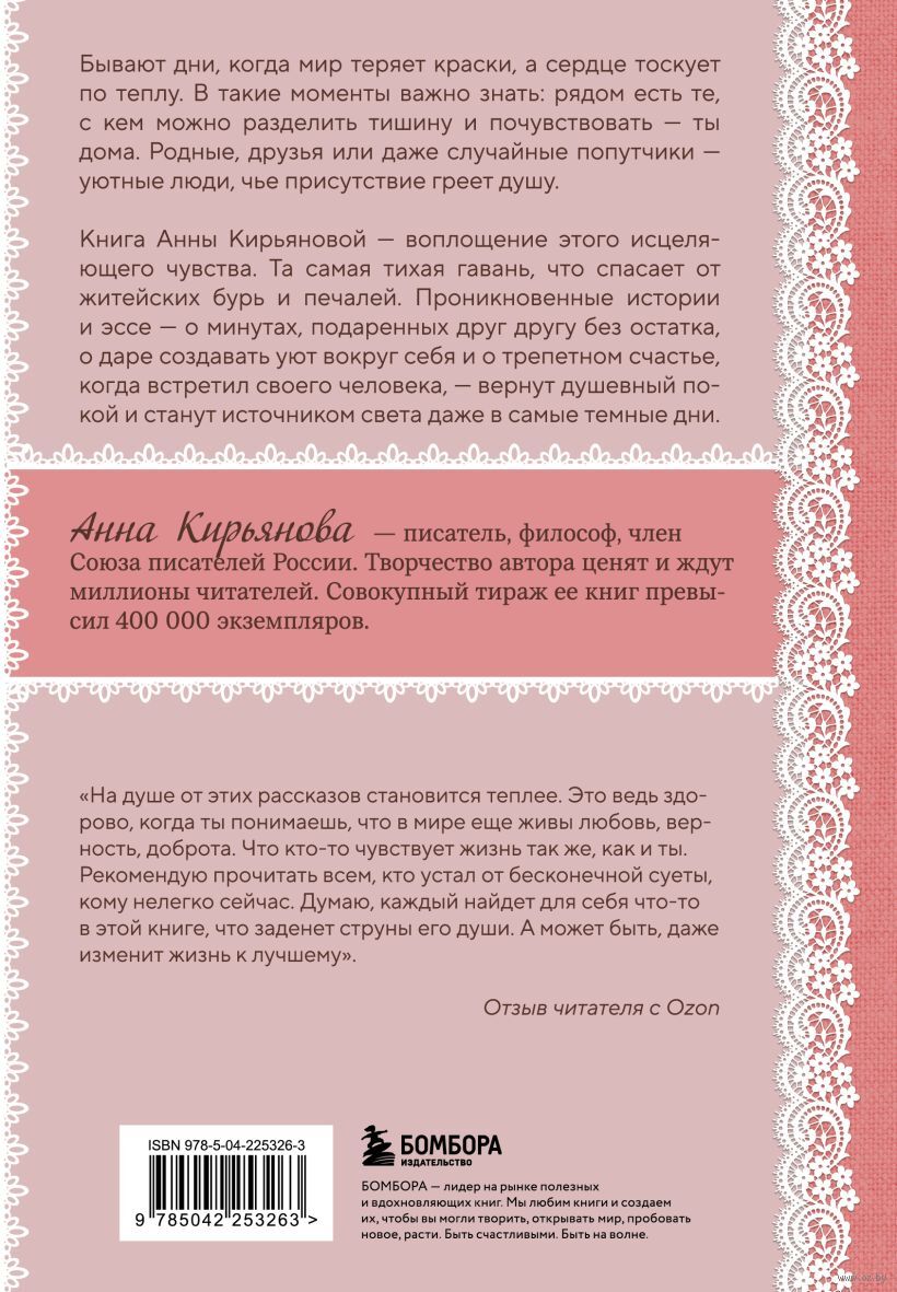 Книга Анны Кирьяновой – воплощение этого исцеляющего чувства, та самая тихая гавань, что спасает от житейских бурь и печалей. Проникновенные истории и эссе – о минутах, подаренных друг другу без остатка, о даре создавать уют вокруг себя и о трепетном счастье, когда встретил своего человека, – вернут душевный покой и станут источником света даже в самые темные дни.