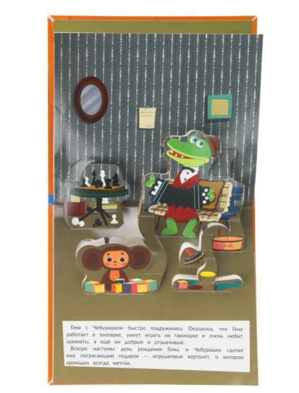 Малыш с удовольствием будет листать яркие странички и слушать интересную историю про приключения милого ушастика Чебурашки и его друзей, которая будет "оживать" на глазах благодаря объёмным картинкам. Читая вместе с родителями эту занимательную книгу, ребёнок будет увеличивать свой словарный запас и расширять кругозор.
