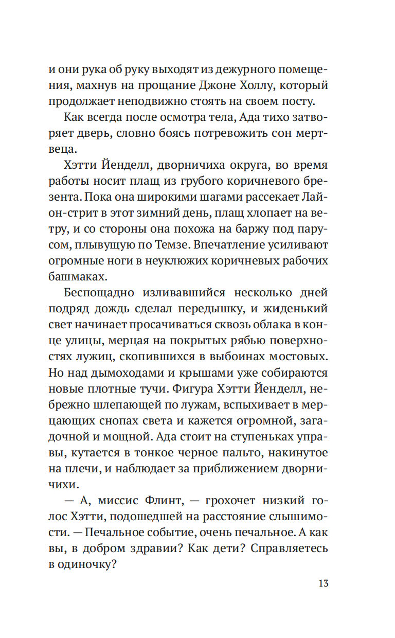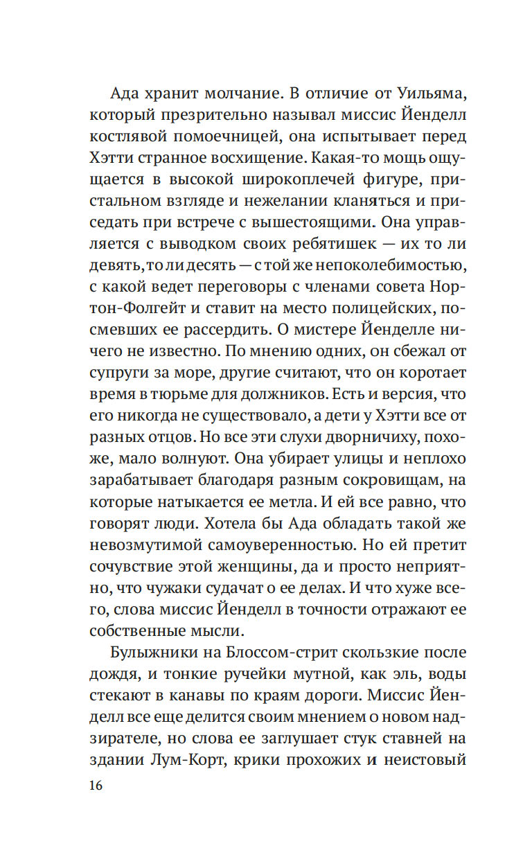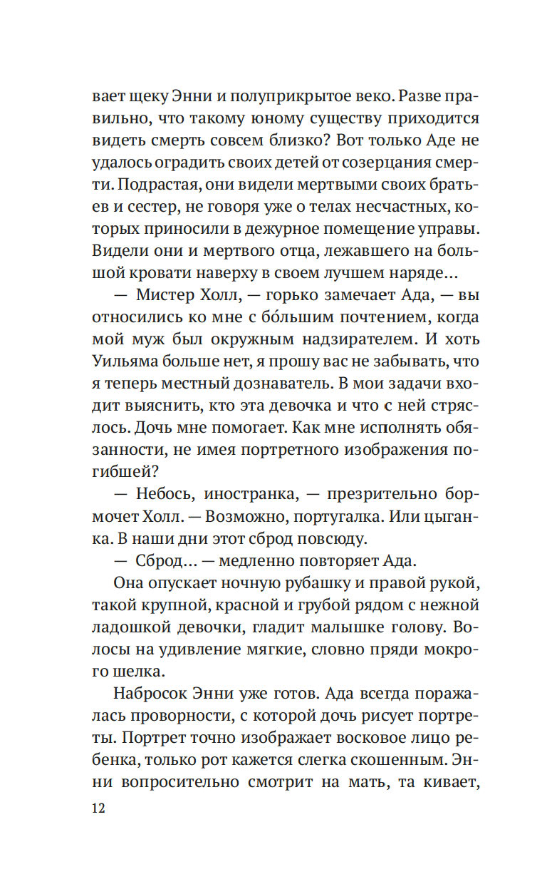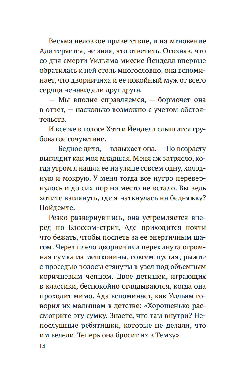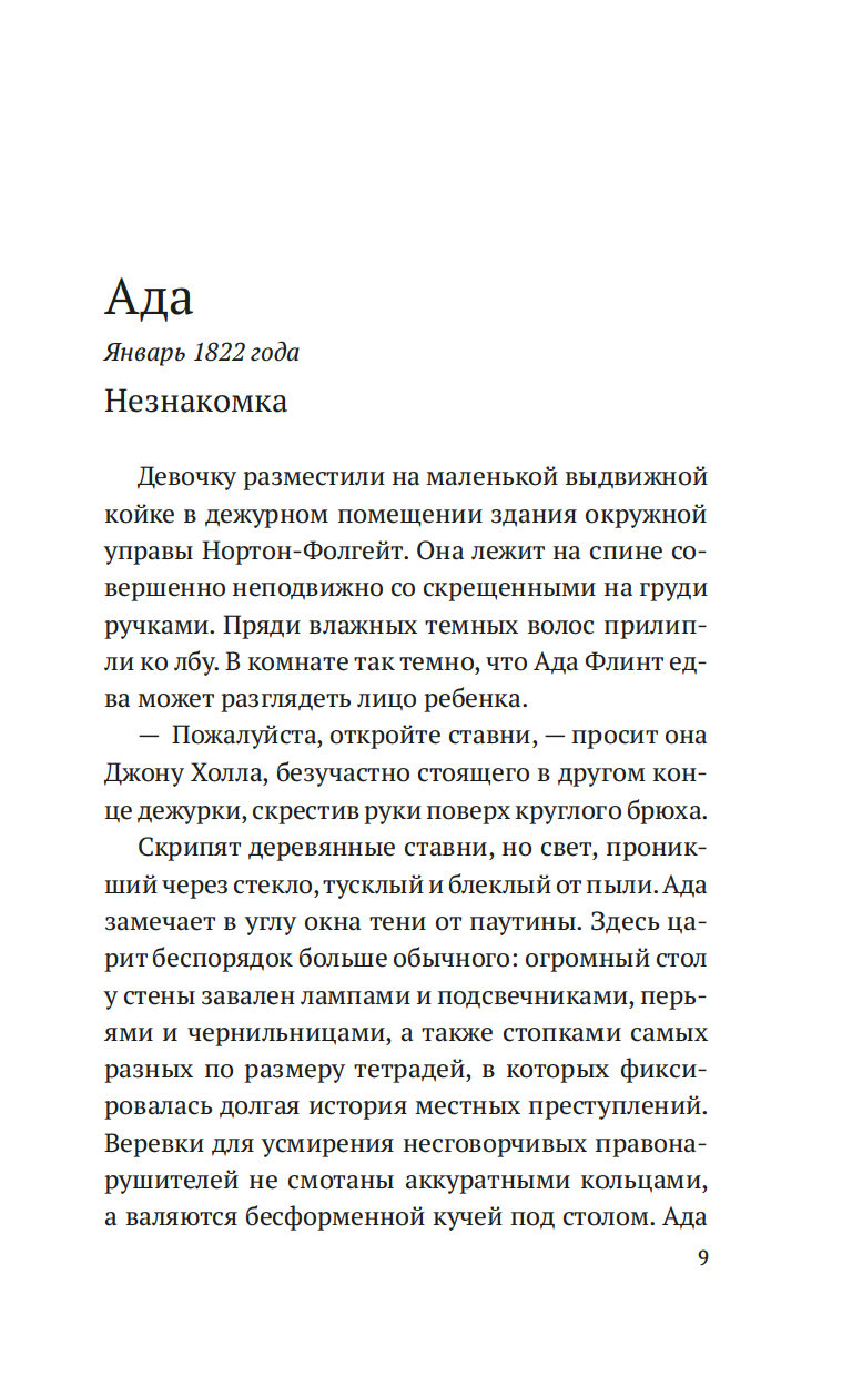 Лондон, начало XIX века. После внезапной смерти Уильяма Флинта, надзирателя округа Нортон-Фолгейт, его жена Ада остается одна с целым выводком детей. Из милости вдову назначают дознавателем при городской управе – работа сложная и невеселая, но Ада старается выполнять ее по совести. И когда на заброшенной конюшне обнаруживается труп восьмилетней девочки, Ада полна решимости выяснить, кем была малышка и кто ее родители. Однако загадки множатся, следствие то и дело заходит в тупик, и Ада вынуждена просить помощи у старого друга, художника Рафаэля Да Силвы…