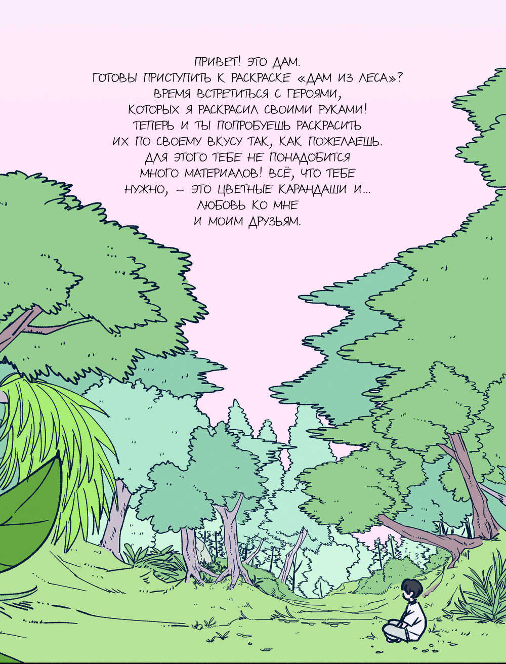 "Дам из леса. Раскраска по вебтуну" – сборник из 52 трогательных сцен популярного вебтуна, действие которого разворачивается в мягком постапокалиптическом мире. На разворотах представлены оригинальные кадры и контуры для раскрашивания, позволяющие передать атмосферу истории и создать собственные цветовые решения. Крупные иллюстрации и плотная бумага делают раскрашивание комфортным, а тёплая атмосфера вебтуна дарит спокойствие и творческий отдых.