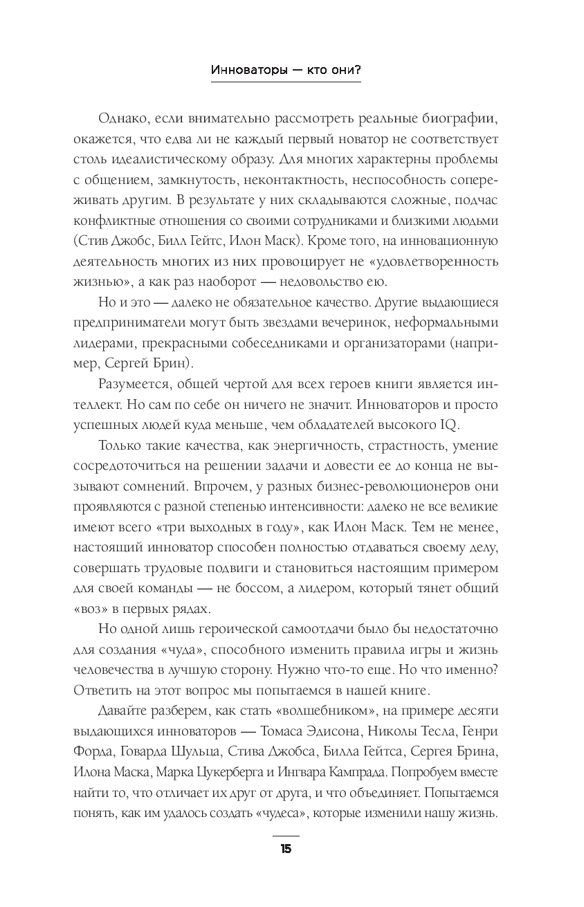 Десять гениев. Десять революций. Десять историй, навсегда изменивших мир. От электричества Эдисона до космических амбиций Маска, от конвейера Форда до цифровой вселенной Цукерберга – эта книга расскажет, как дерзкие идеи становились реальностью. Их изобретения, бизнес-стратегии и даже неудачи перекроили нашу повседневность. Но за каждым прорывом стоят человеческие истории: упрямство, одержимость, гениальность и сомнения. Это не просто биографии – это десять уроков от людей, которые не ждали наступления будущего, а создавали его.