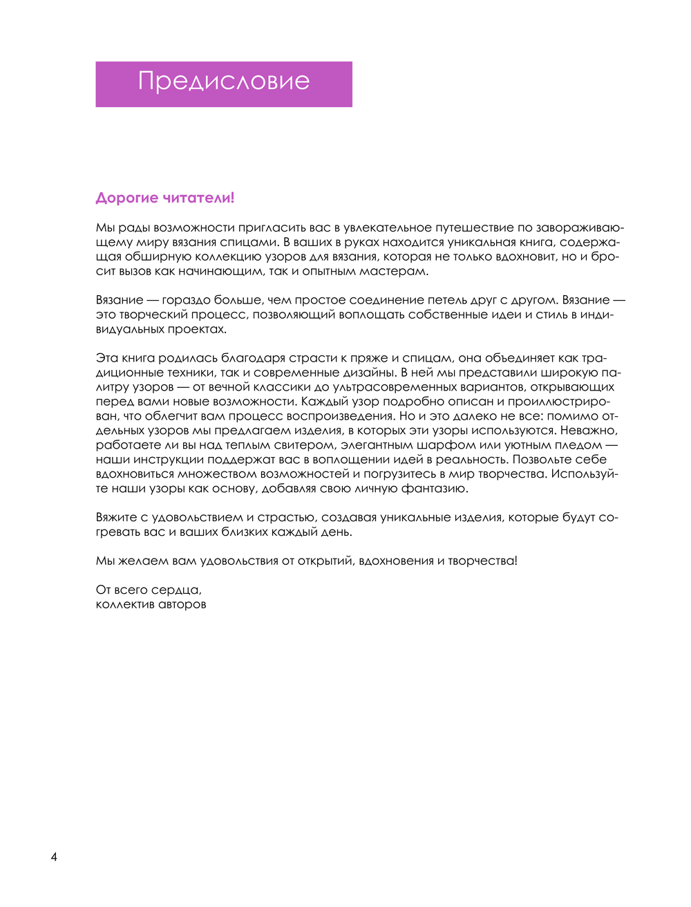 Особую ценность книге придает авторский коллектив, объединивший четырех признанных мастеров вязания, чей богатый опыт нашел отражение в этом 320-страничном руководстве. Будьте готовы к тому, что после знакомства с этим изданием ваш список планируемых проектов значительно пополнится новыми интересными замыслами.