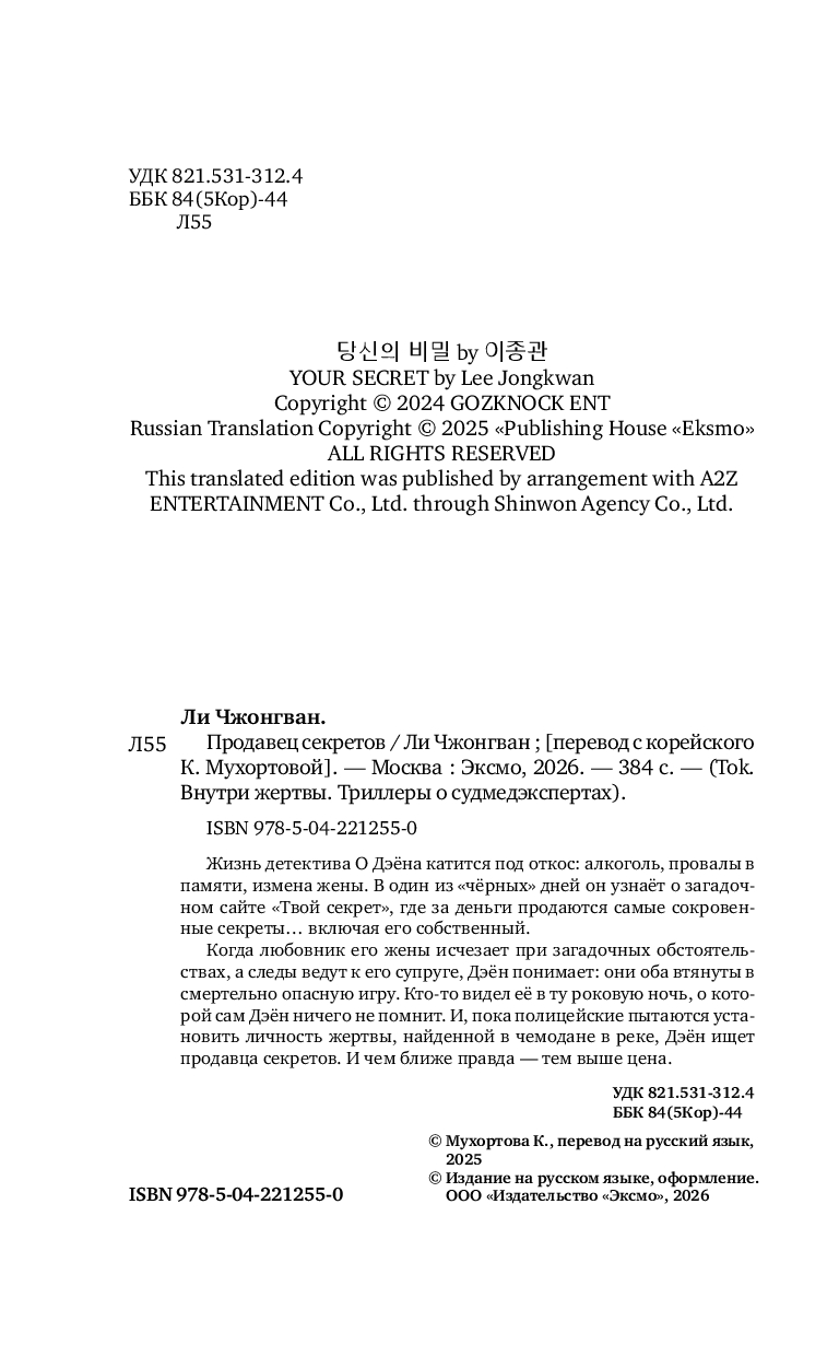 Когда любовник его жены исчезает при загадочных обстоятельствах, а следы ведут к его супруге, Дэён понимает: они оба втянуты в смертельно опасную игру. Кто-то видел ее в ту роковую ночь, о которой сам Дэён ничего не помнит. И, пока полицейские пытаются установить личность жертвы, найденной в чемодане в реке, Дэён ищет продавца секретов. И чем ближе правда — тем выше цена.