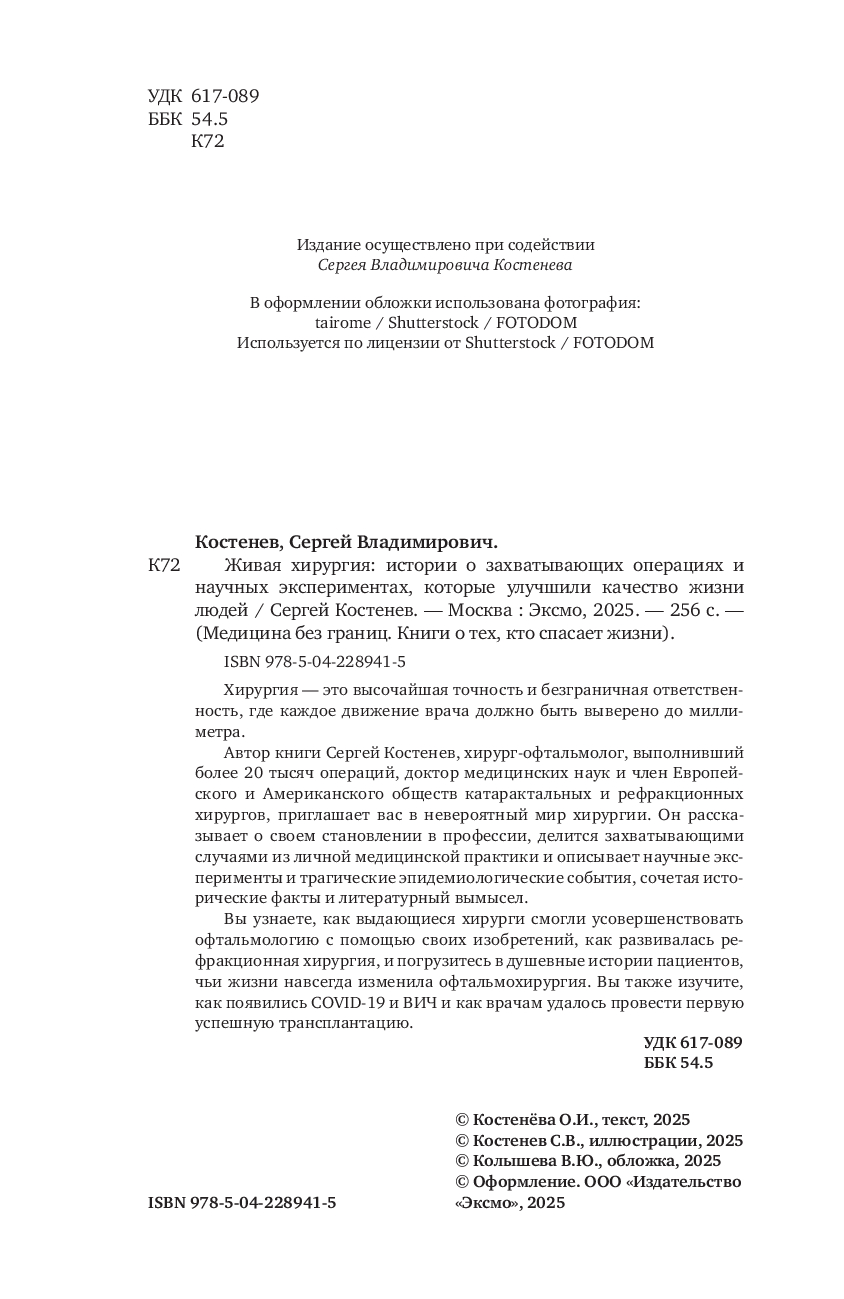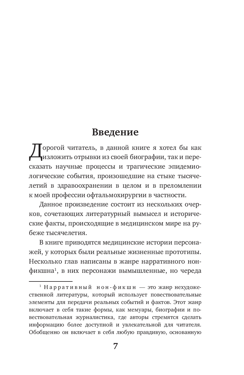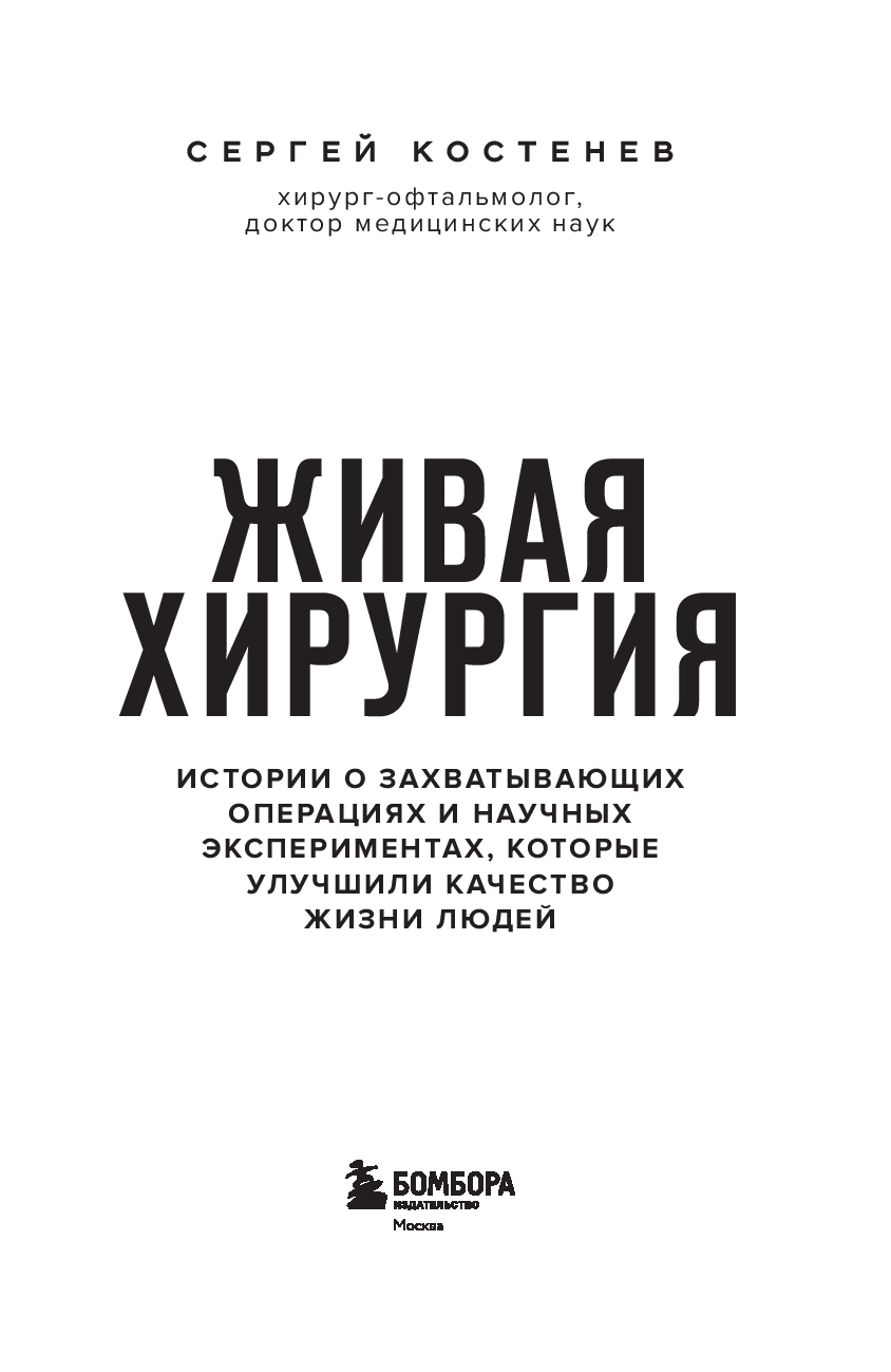 Автор книги Сергей Костенев, хирург-офтальмолог, выполнивший более 20 тысяч операций, доктор медицинских наук и член Европейского и Американского обществ катарактальных и рефракционных хирургов, приглашает вас в невероятный мир хирургии. Он рассказывает о своем становлении в профессии, делится захватывающими случаями из личной медицинской практики и описывает научные эксперименты и трагические эпидемиологические события, сочетая исторические факты и литературный вымысел.